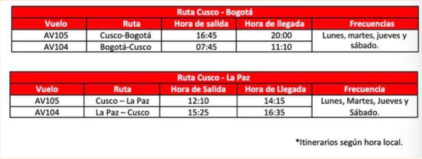 《秘华商报》讯:Avianca航空公司宣布开通库斯科至波哥大(哥伦比亚)和拉巴斯(玻利维亚)的直飞航班,每个目的地每周四班。该公司成为唯一一家将Alejandro Velasco Astete国际机场与南美两个国际城市连接起来的航空公司。