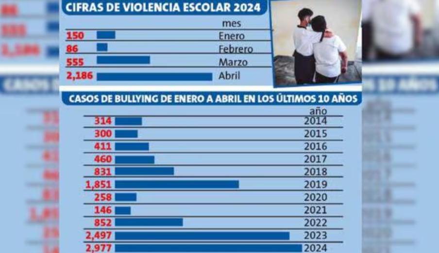 根据该报告,2024年1月至4月期间,校园霸凌案件总数为2,977起:1月有15起;2月有86起;3月555起;4月为2,186起。在这段时间里,发生了1,304起身体暴力案件;心理暴力有1,189件;性暴力有484件。