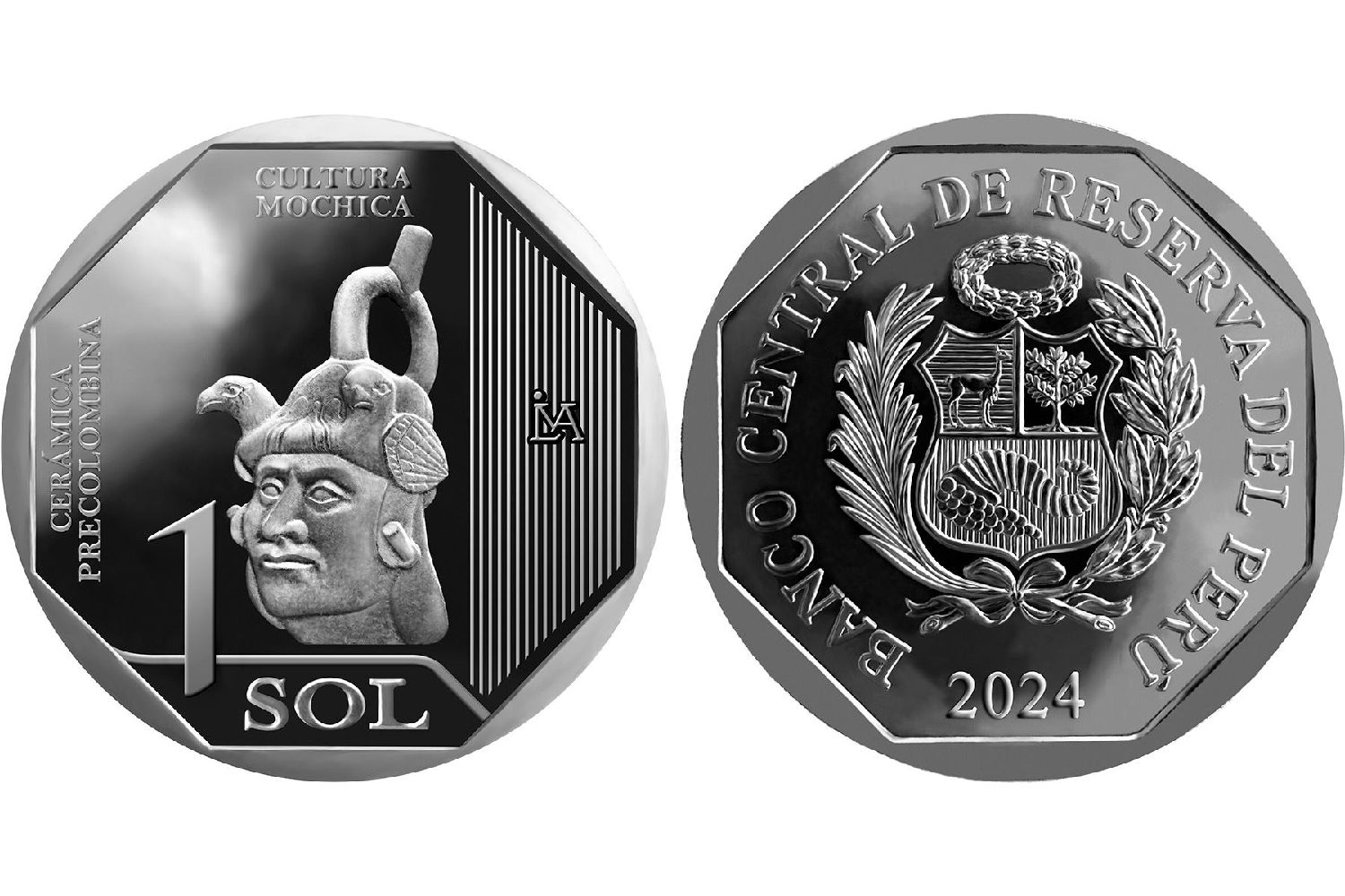 硬币的顶部是“Cultura Mochica”字样,下部是面额数字和货币单位名称。右侧还可以看到垂直线条的几何设计和国家造币厂的标志,左侧是“Cerámica Precolombina”一词。