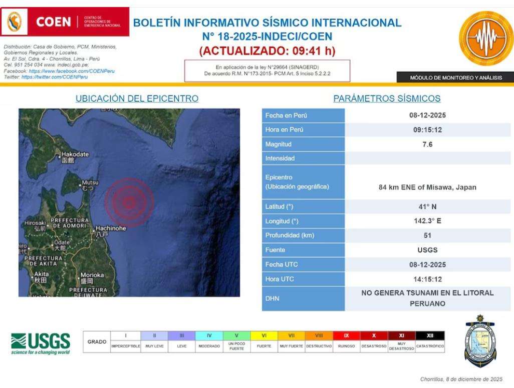 《秘华商报》讯:日本东北沿海12月8日23:15发生7.6级强震,气象厅(JMA)随即发布海啸警报,数以千计居民紧急撤离。强震引发太平洋沿岸国家关注,秘鲁方面对此进行了技术评估,并发布官方通报。