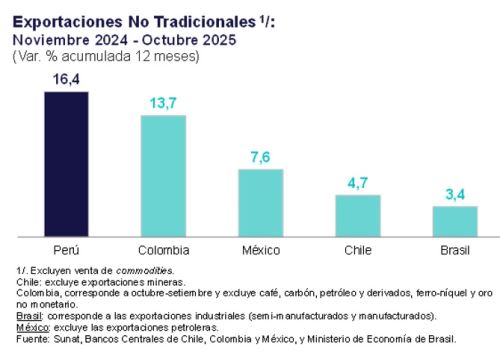 从长期走势看,秘鲁同样保持领先。按过去5年的年均增长率计算,秘鲁非传统出口年均增长10.5%,同样高于哥伦比亚10%、墨西哥8.4%、巴西7.7%和智利5.7%。央行表示,这一表现反映出秘鲁非传统出口基础不断巩固,在区域内具备较强韧性与增长潜力。