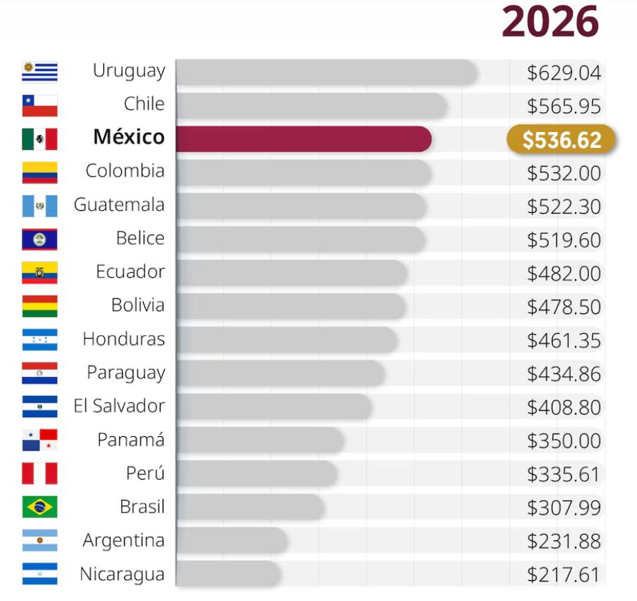 根据榜单,乌拉圭以629.04美元位居首位,智利为565.95美元,墨西哥达536.62美元。墨西哥总统克劳迪娅·辛鲍姆·帕尔多(Claudia Sheinbaum Pardo)表示,墨西哥一年内从第6位升至第3位,强调以社会公平改善家庭经济。