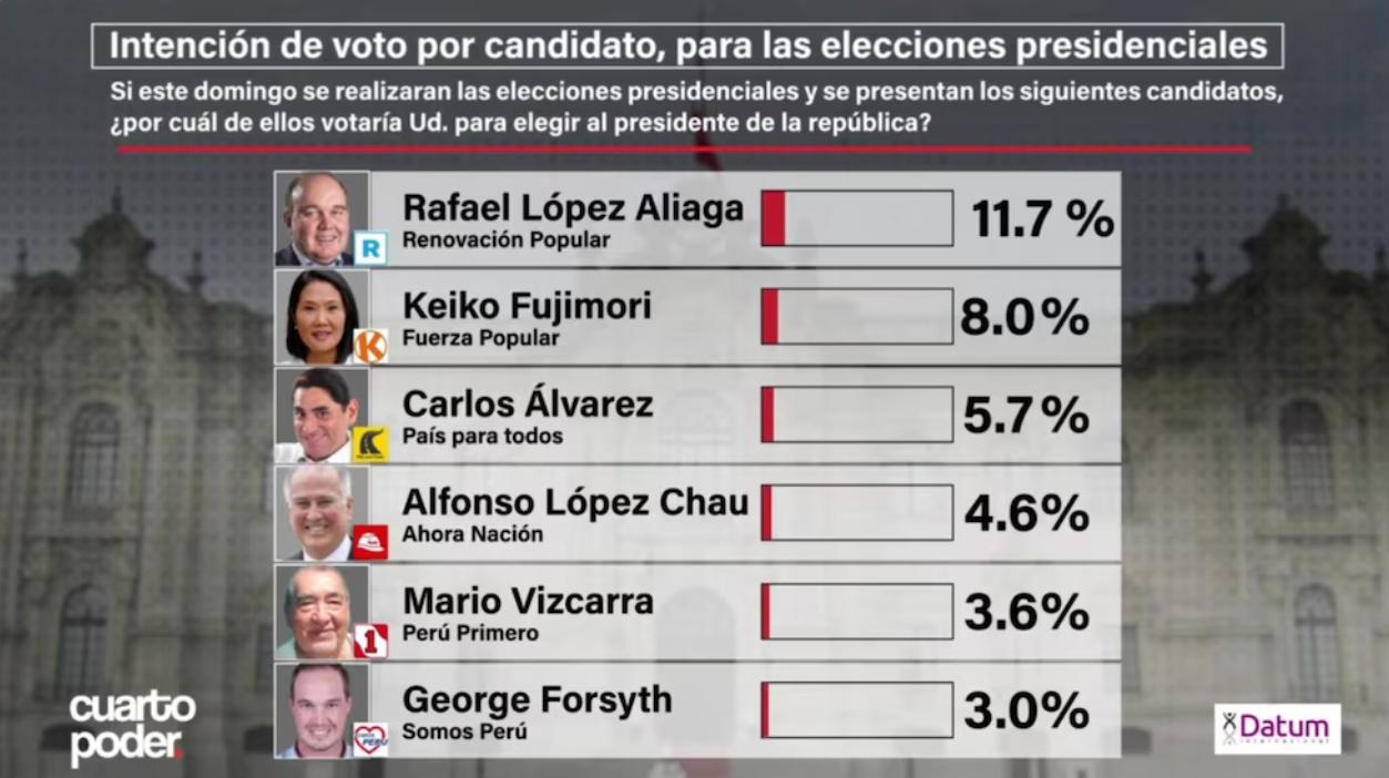 在具体候选人支持率上,前利马市长Rafael López Aliaga以11.7%位居第一,Keiko Fujimori以8%位列第二,CarlosÁlvarez以5.7%居第三。Alfonso López Chau以4.6%升至第四,而因前总统(候选人之兄弟)涉腐案受影响的Mario Vizcarra则降至第五,支持率为3.6%。