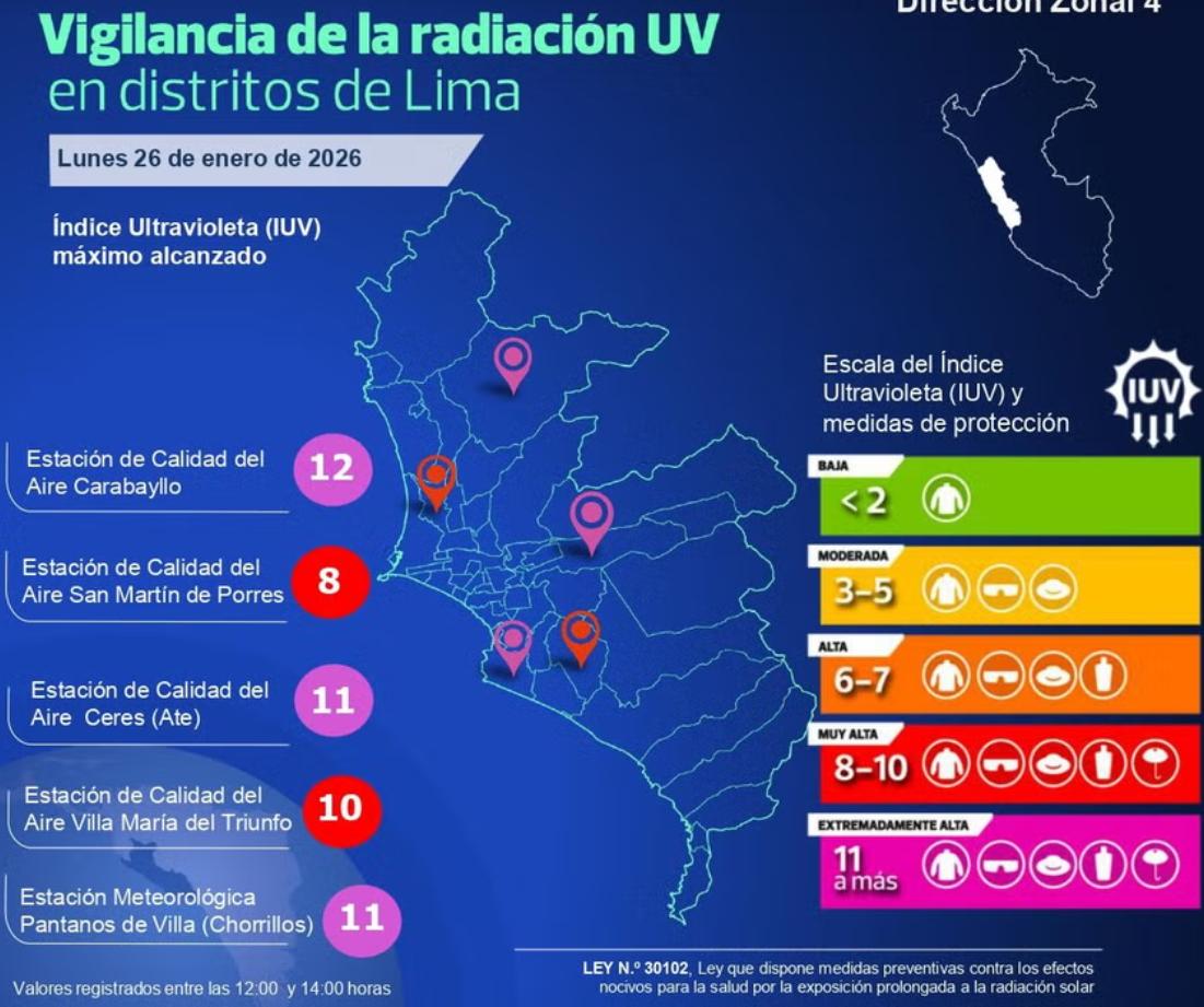 值得注意的是,当前不仅气温居高不下,紫外线辐射水平也极高。Senamhi数据显示,利马日前已出现“极端高”级别紫外线指数,此种情况在橙色预警期间可能持续。专家提醒民众务必采取充分防护措施。