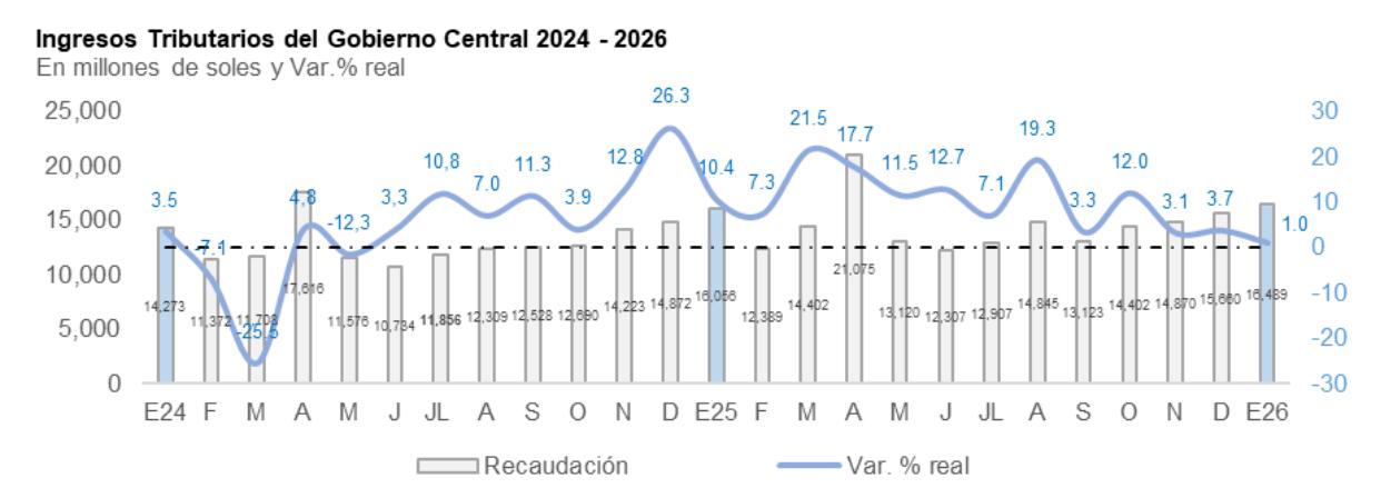 《秘华商报》讯:秘鲁国家税务局(Sunat)2月9日公布,2026年1月中央政府税收收入(扣除退税后)达164.89亿索尔,较2025年同期增长1%,实现连续20个月增长。增长主要得益于2025年12月经济活动良好带来的税收义务、主要出口金属(铜、金)价格上涨、企业2024年盈利改善带来的月度预缴税款系数提高,以及税务部门开展的税收缺口追缴行动。