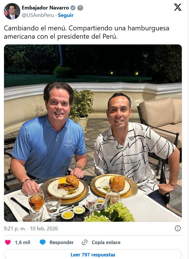 《秘华商报》讯:美国驻秘鲁大使伯尼·纳瓦罗(Bernie Navarro)2月11日在社交媒体发布一张与秘鲁总统何塞·耶里(JoséJeríOré)共进汉堡的合影,配文“换菜单”,引发外交界广泛解读。此举正值秘鲁总统耶里因与华商非正式会面而陷入“中餐门”争议之际,被视作美国在拉美制衡中国影响力的明确信号。