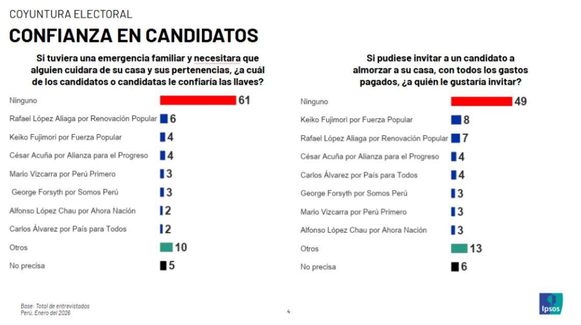 在“愿意托付钥匙”的选项中,Renovación Popular候选人拉斐尔·洛佩斯·阿里亚加(Rafael López Aliaga)以6%居首,其余候选人支持率均未超过3%。在“愿意邀请共餐”选项中,Fuerza Popular候选人藤森庆子(Keiko Fujimori)以8%领先,洛佩斯·阿里亚加以5%紧随其后。