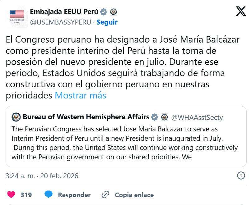 《秘华商报》讯:美国国务院西半球事务局19日通过社交媒体X表示,将继续与秘鲁政府保持“建设性合作”。该机构发文称:“秘鲁国会已任命何塞·玛丽亚·巴尔卡萨尔(JoséMaría Balcázar)为秘鲁临时总统,任期至7月新总统就职。在此期间,美国将继续与秘鲁政府就共同优先事项开展建设性合作。”