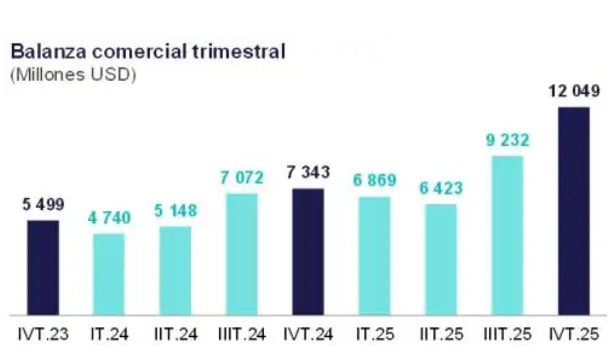 《秘华商报》讯:秘鲁中央储备银行(BCR)23日报告显示,2025年秘鲁贸易顺差达345.73亿美元,较2024年增加102.71亿美元。这一数字占国内生产总值的10.1%,较2024年提高1.9个百分点,创下自2006年(10.3%)以来的最高水平。