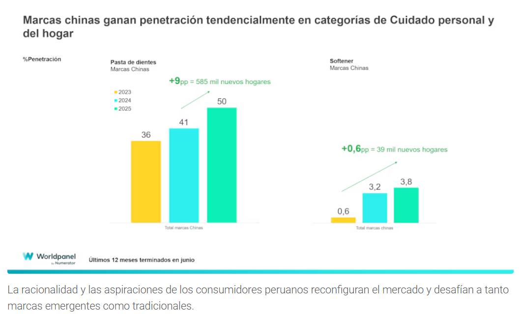 《秘华商报》讯:市场研究机构世界面板(Worldpanel by Numerator)数据显示,2025年亚洲来源品牌在秘鲁的市场渗透率升至近3年最高,推动本地消费习惯转变。其中牙膏品类增长尤为显著,最近一年渗透率提升9个百分点,新增585000户家庭使用相关品牌。