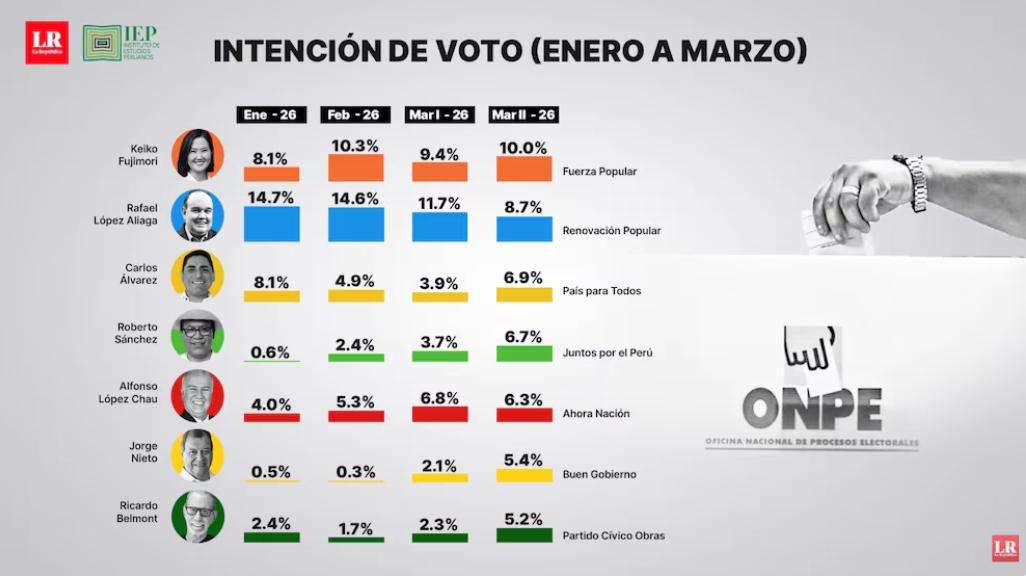 《秘华商报》讯:根据秘鲁研究所(Instituto de Estudios Peruanos IEP)最新总统选举民调,人民复兴党(Renovación Popular)候选人拉斐尔·洛佩斯·阿利亚加(Rafael López Aliaga)自2026年1月以来支持率下降约6个百分点,呈持续下滑趋势,已不再位居首位。