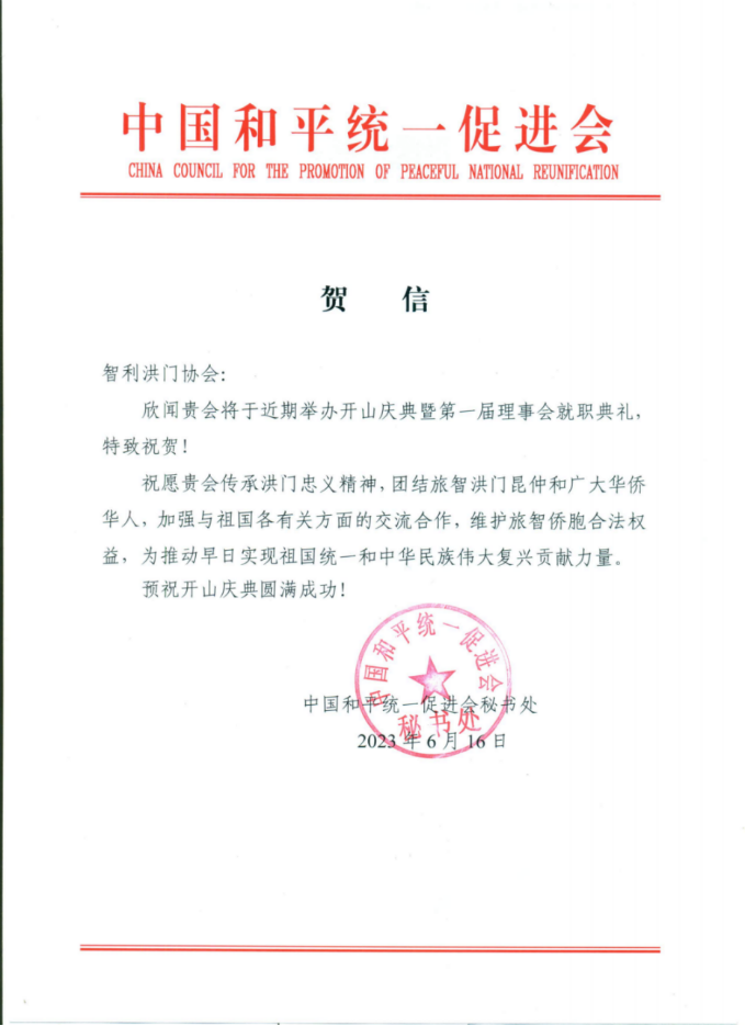 中国和平统一促进会对于智利洪门协会的成立特发来贺信,并在贺信中勉励到,智利洪门协会应传承洪门忠义精神,团结旅智洪门昆仲和广大华侨有关方面的交流合作,维护旅智侨胞合法权益,为推动早日实现祖国统一和中华民族伟大复兴贡献力量。世界洪门联合总会在贺信中特别提到“四海同心,振兴中华。”阿根廷洪门协会、巴西洪门南美总会、巴拉圭洪门协会、厄瓜多尔洪门总会、阿根廷平潭同乡会、阿根廷拉普拉塔华商联谊会、阿根廷华侨连江同乡会等也都发来贺信贺函。