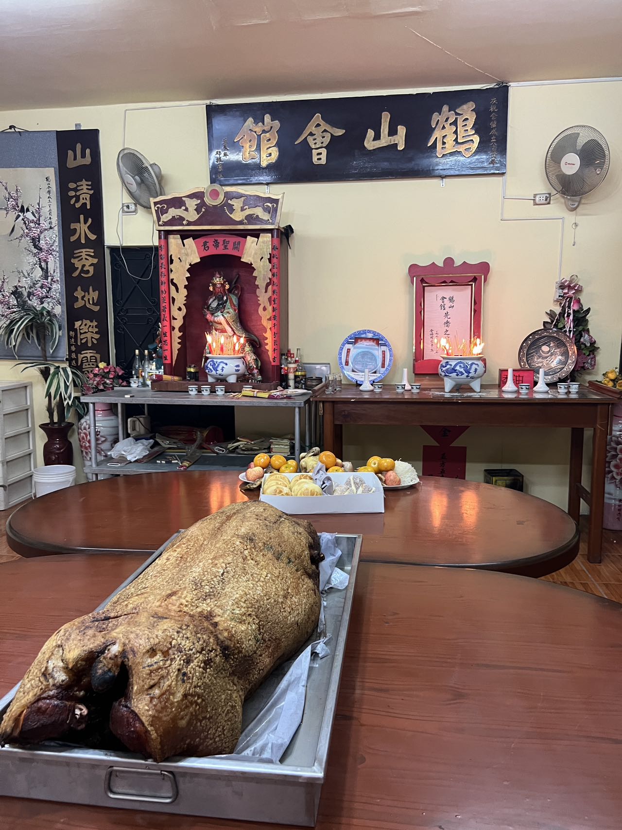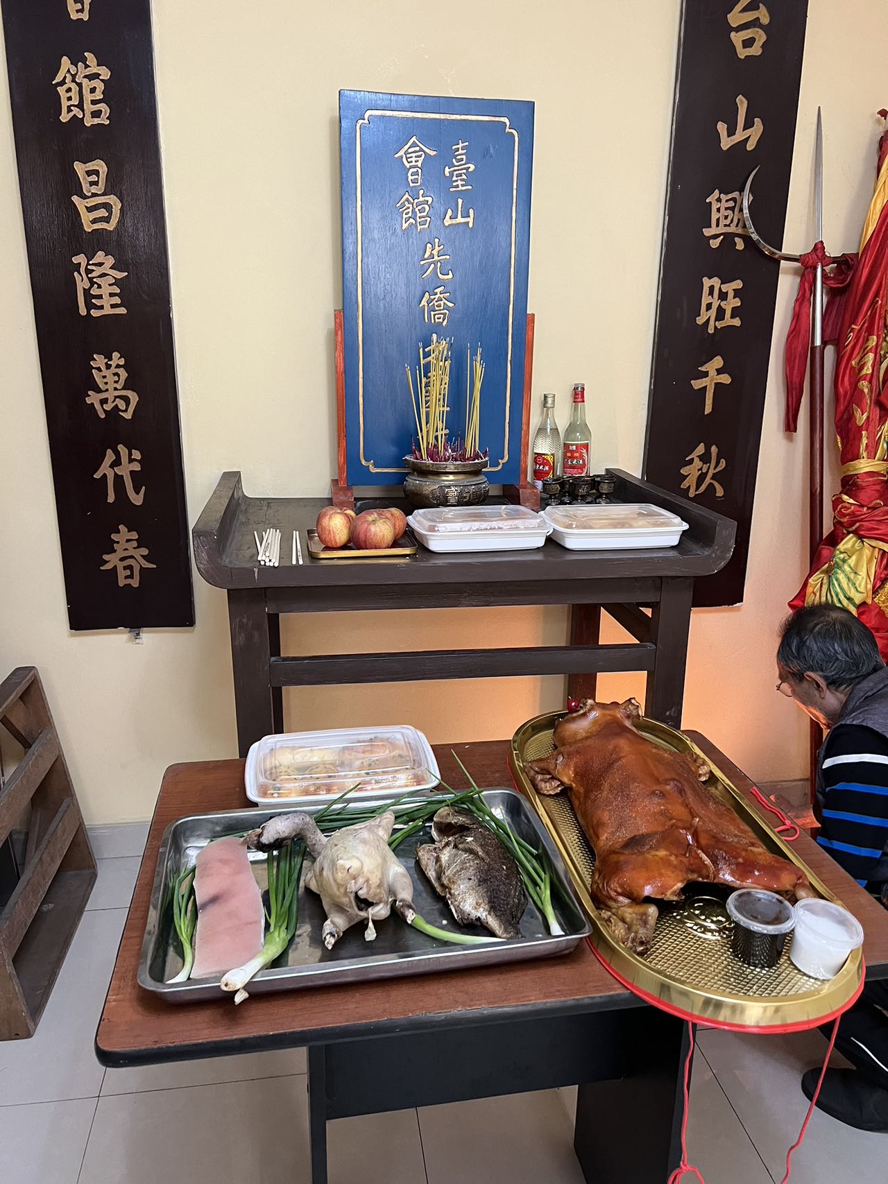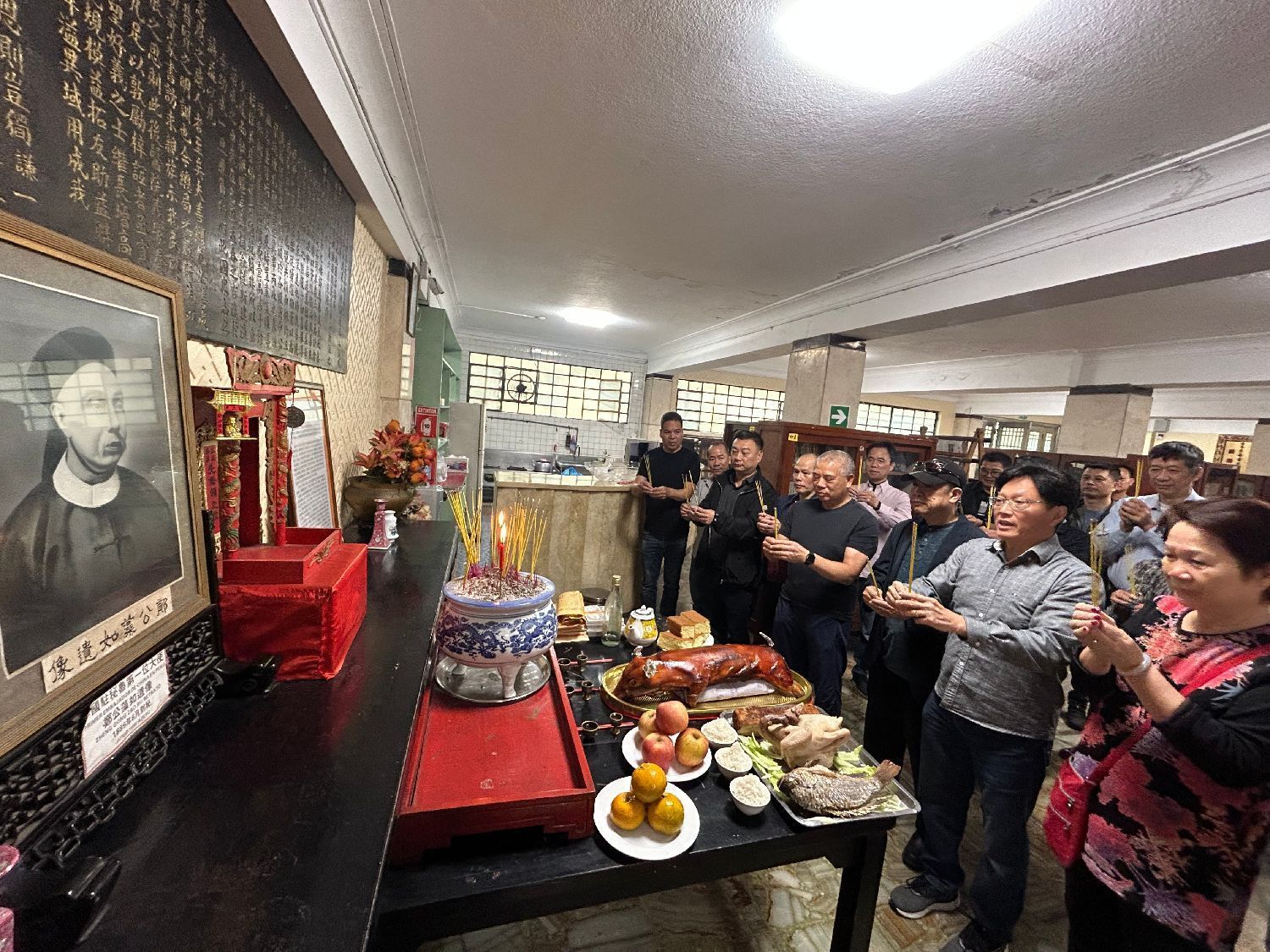 11月1日一大早,各会馆工作人员就带着准备好的三牲、点心、生果及香烛等祭品来到会馆布置祭台,预定好的金猪也按时抵达。临近中午,各地乡亲陆续抵达各会馆,秩序井然地分别向关公香和先侨牌位敬拜上香。随后,各会馆主席携理监事一起依次向关帝和先侨叩拜上香。