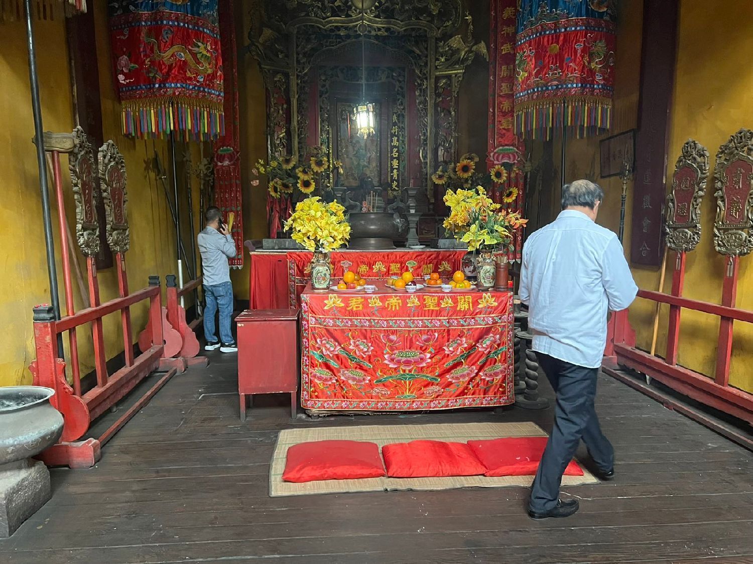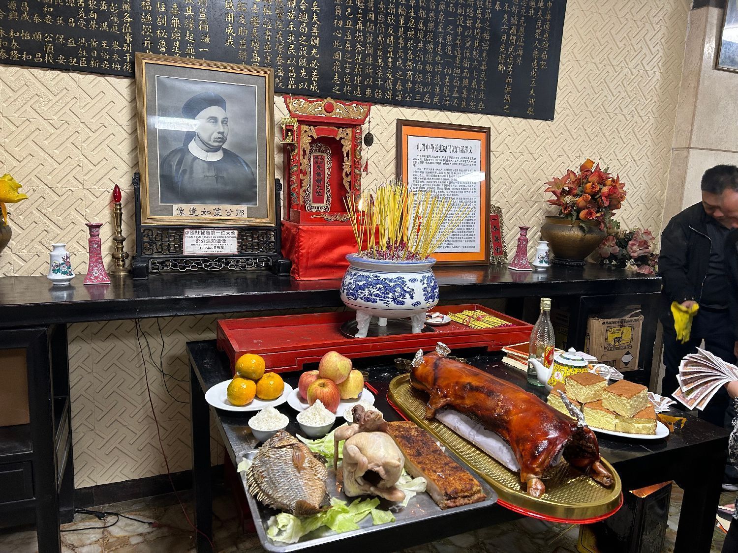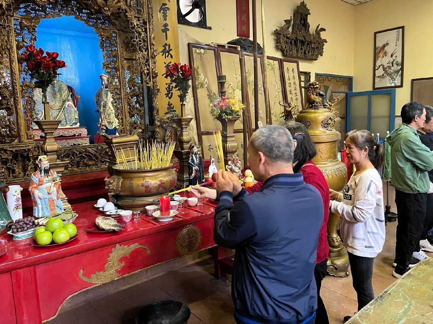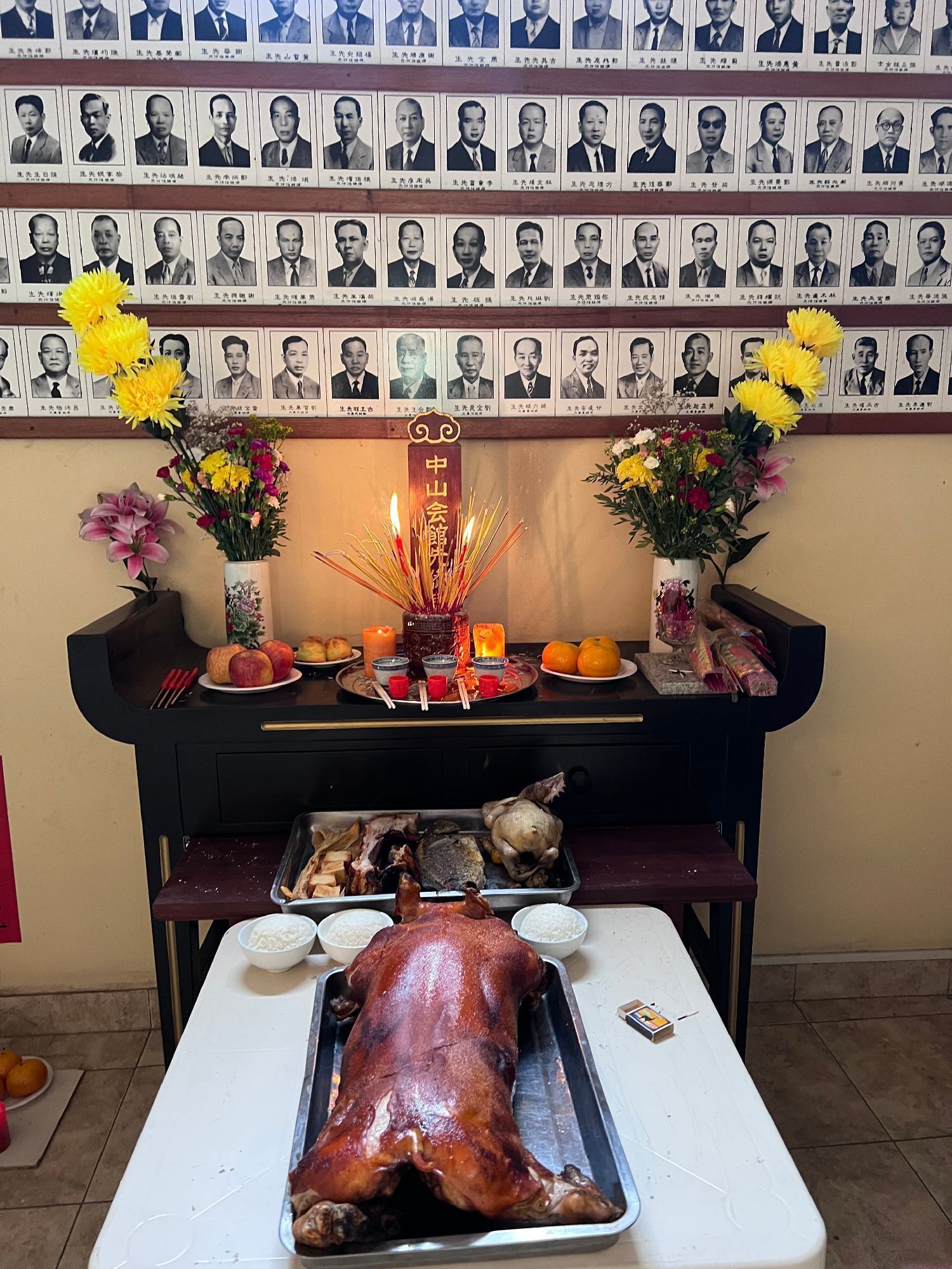 11月1日一大早,各会馆工作人员就带着准备好的三牲、点心、生果及香烛等祭品来到会馆布置祭台,预定好的金猪也按时抵达。临近中午,各地乡亲陆续抵达各会馆,秩序井然地分别向关公香和先侨牌位敬拜上香。随后,各会馆主席携理监事一起依次向关帝和先侨叩拜上香。