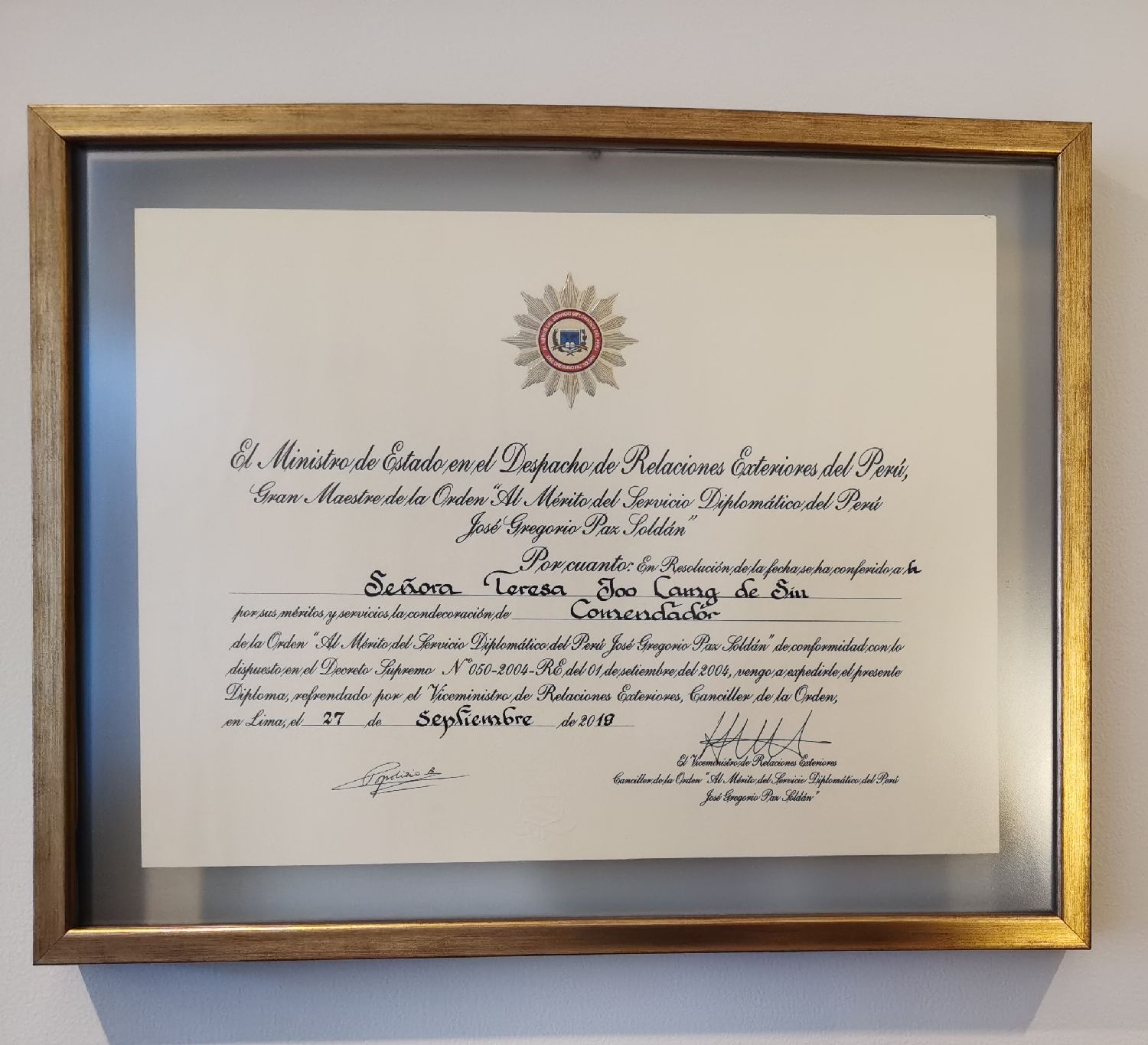 2018年, 秘鲁国会和秘鲁外交部给她颁发了荣誉证书,充分肯定她为中秘友谊所作出的贡献。