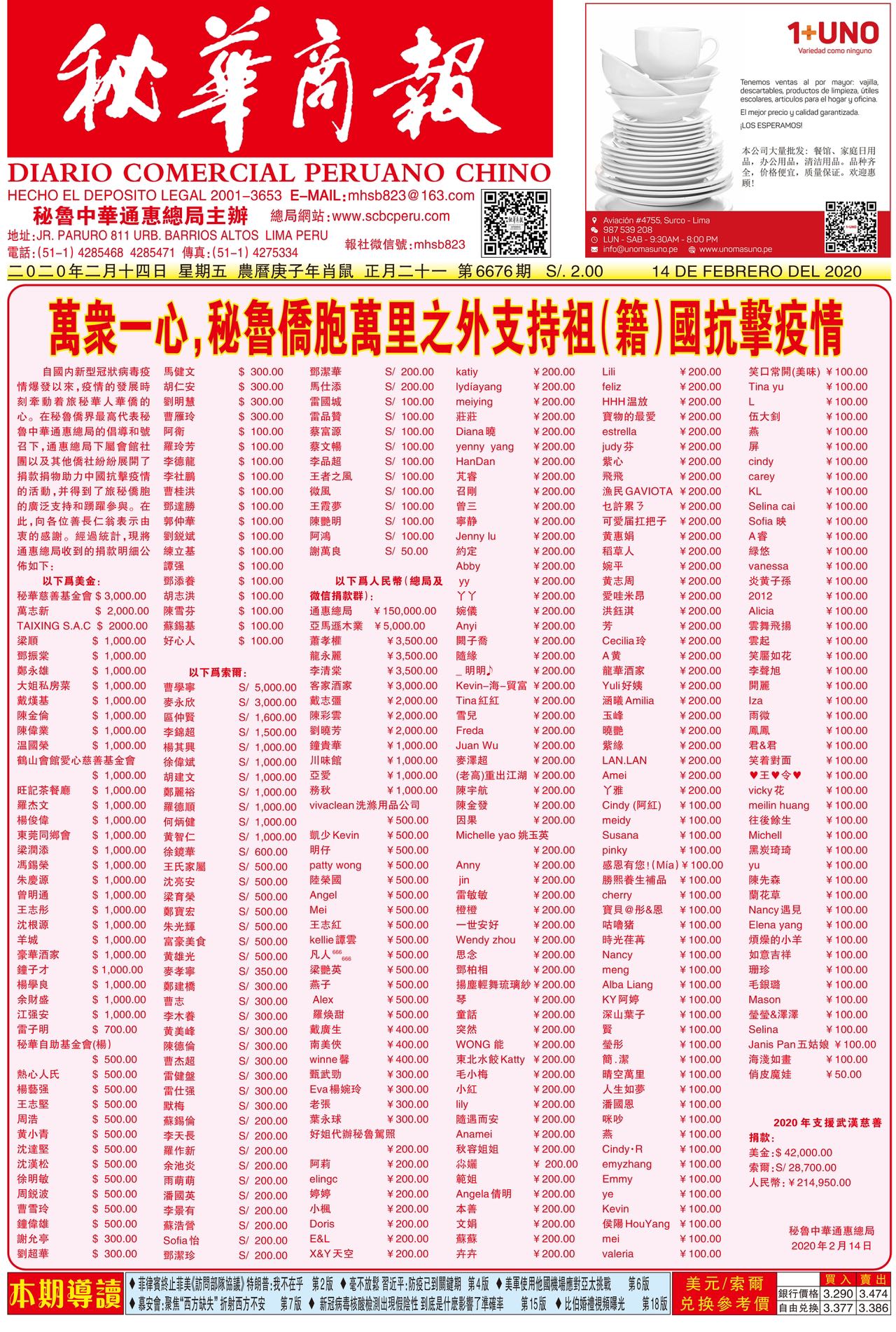 在疫情期间,旅秘侨胞团结一致,在各社团的呼吁下,踊跃捐款捐物积极秘鲁和中国抗疫。