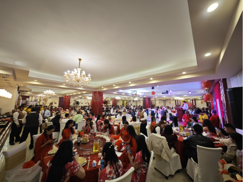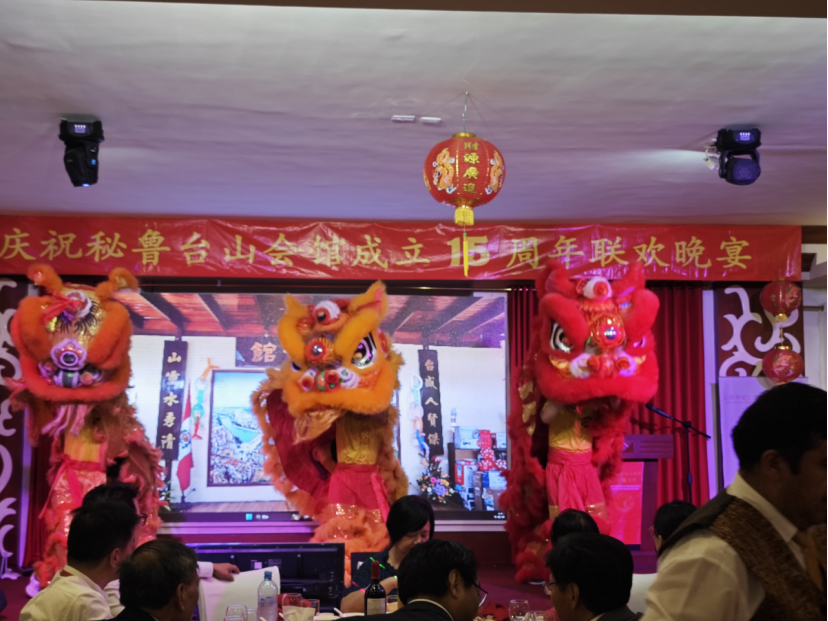 当天晚上八点,在翡翠酒家,在锣鼓声和舞狮的彩头下,庆典晚宴正式开始。中国驻秘鲁大使馆公使次旺平措、领事訾盛楠、秘鲁通惠总局主席罗文杰、沈达坚、监事长陈伟业、财政主任周翠萍、秘鲁中资企业协会副会长万志新、福建同乡会会长卢晓、浙江商会会长刘强兵、秘鲁各侨社、中资企业领导代表、里卡多帕尔玛大学孔子学院代表、侨界知名人士、旅秘相乡亲以及来自美国旧金山美洲刘族横水同乡会代表团、委内瑞拉中南美洲和平统一促进会代表团、厄瓜多尔赤溪同乡会代表团、美国新泽西州横水同乡会代表团、美国宾夕法尼亚州-费城华阜发展会代表团、智利华人企业联合会代表团等台山籍侨团四百多人出席庆典活动。