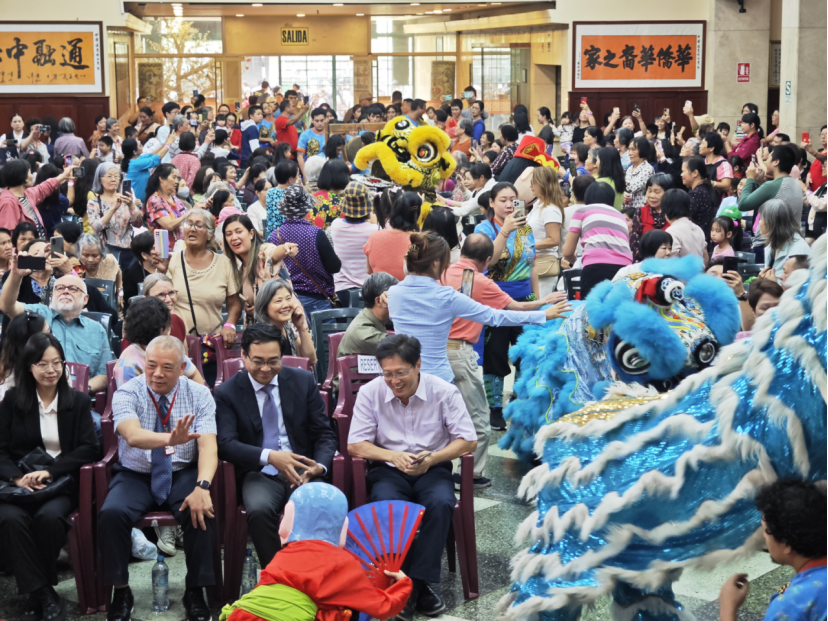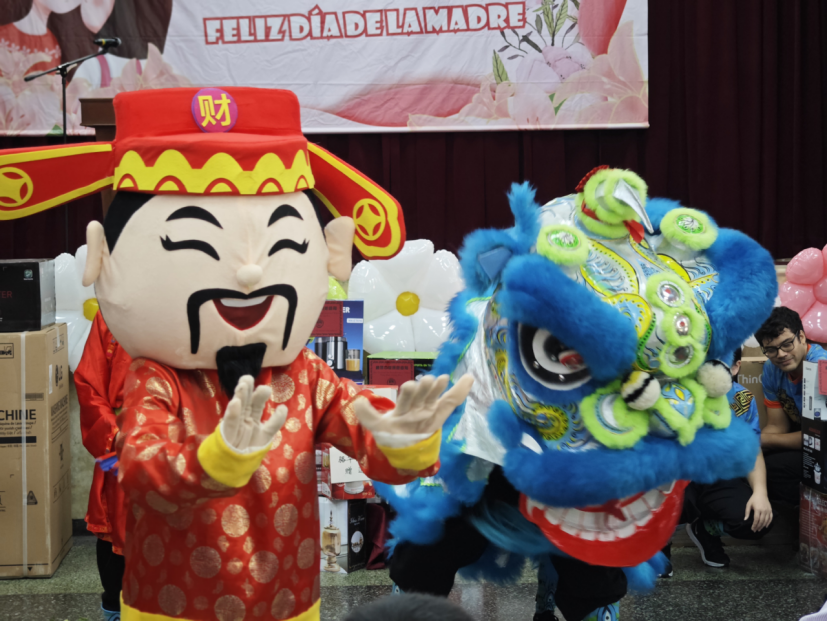 下午两点,随着喜气洋洋的鞭炮声和锣鼓声响起,秘鲁中华通惠总局醒狮团在“大头佛”和“财神爷”的引领下,舞入礼堂。蓝色长龙游弋、起伏、翻滚、腾越、缠绞,穿插于喜笑颜开的侨胞民众之间,通过旺场把福气旺运带到礼堂的每一个角落。五头彩狮逼真地演绎出各种栩栩如生的姿态,展现了狮子的雄壮威武、豪放粗犷、顽皮活泼的神态性格。随着密集的锣鼓卡点声,红色狮子一跃而起,狮头张嘴衔到高挂于礼堂之上的“生菜”,“生菜-生财”,百兽之王一招神狮摆头,狮口扬宝,生菜叶子便像天女散花般飞向四周,好一出瑞狮献宝,现场掌声不断。小朋友们高高兴兴地捡起生菜,捧回了财运和鸿运,整个会场成为了欢乐的海洋。