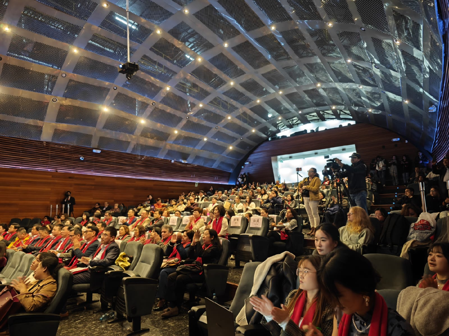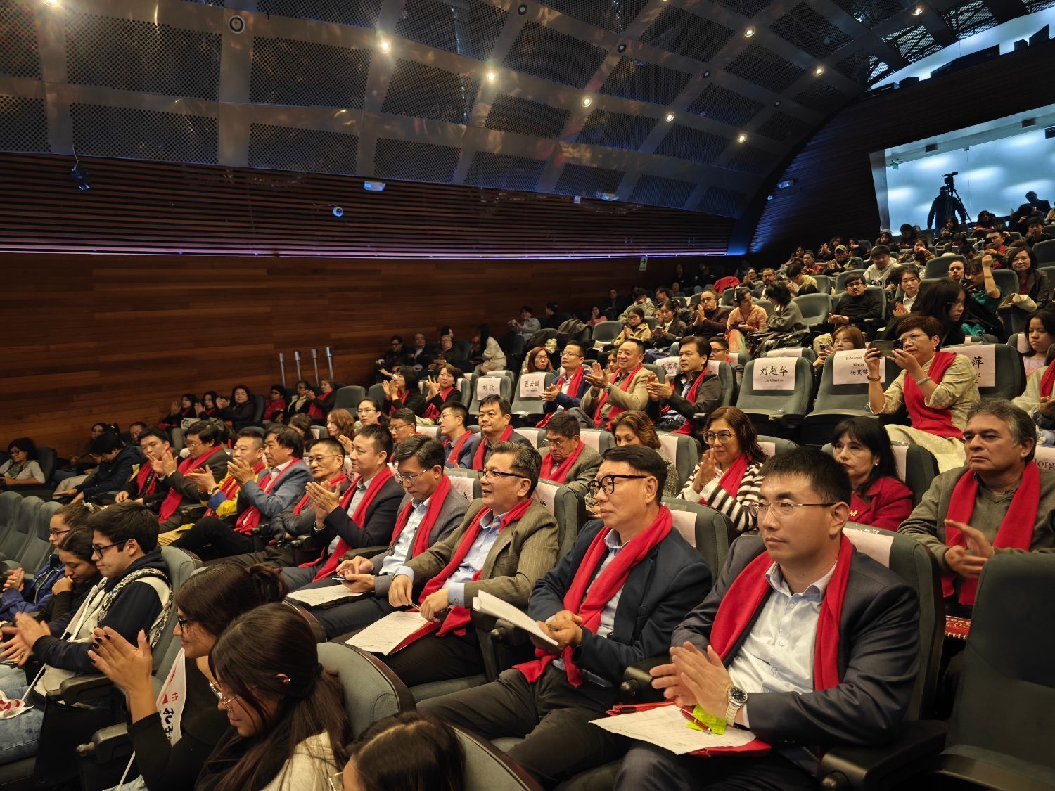 会场中,各企业和侨社赠送的花篮花团锦簇,大红灯笼从会场顶空垂下,主办方赠与到场嘉宾的红围巾、中国日历和玲珑可爱的熊猫,四周环绕着的中国乐章,无不体现着即将上演一场视觉和文化的盛宴。