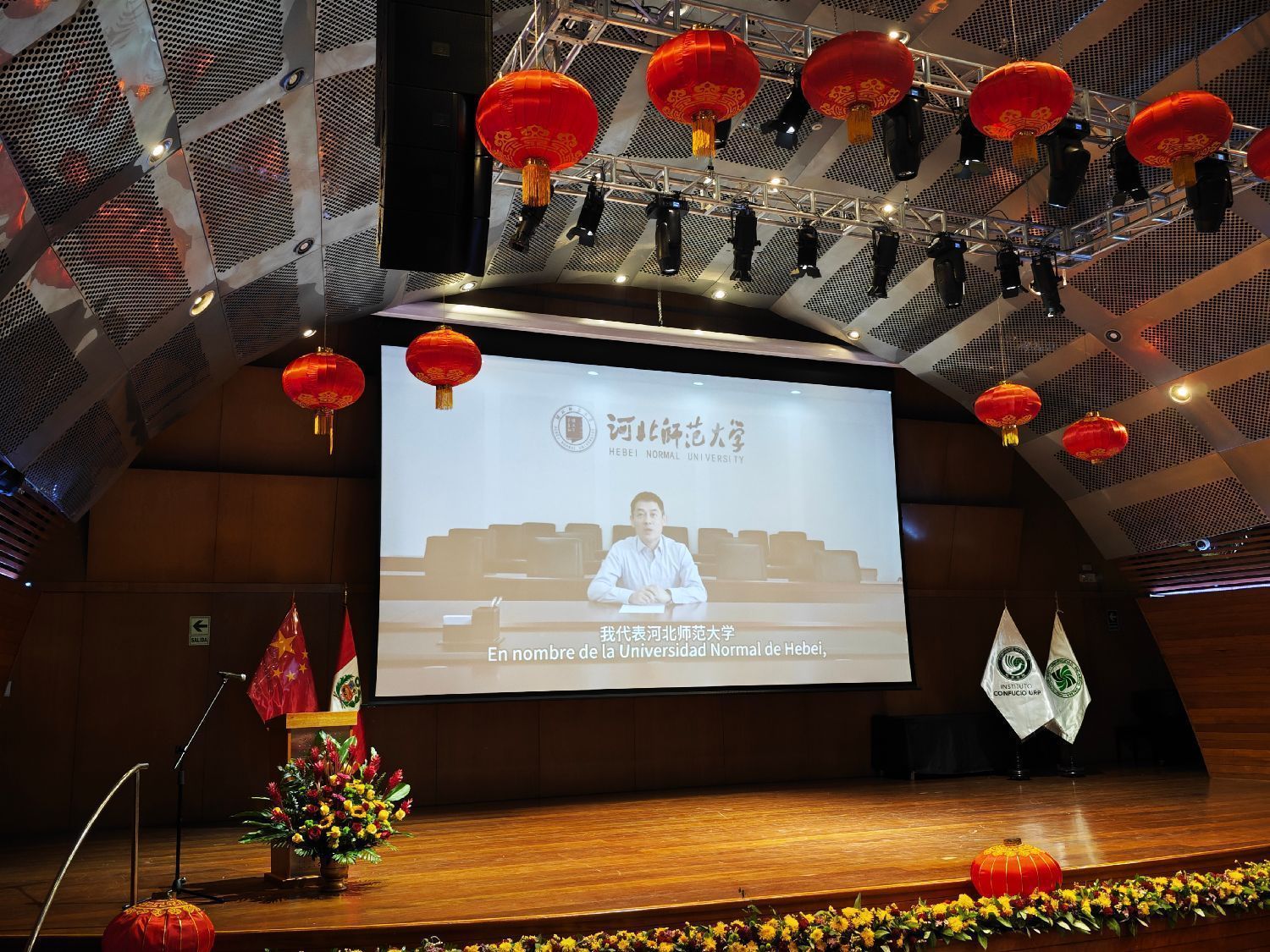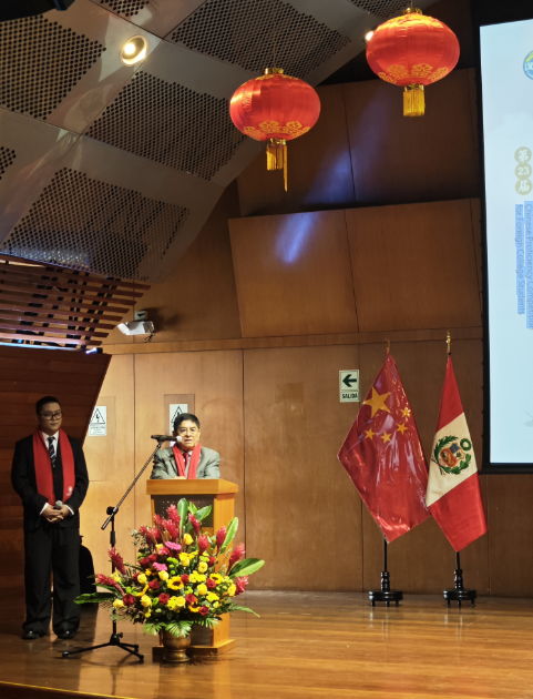 里卡多·帕尔玛大学合作院校-河北师范大学,郭毅副校长在远方发来贺词。他表示,代表河北师范大学向各位参赛选手、嘉宾表示诚挚的欢迎。感谢教育部中外语言交流合作中心、中国驻秘鲁大使馆、秘鲁华人华侨社团和中资企业长期以来对里卡多·帕尔玛大学孔子学院事业发展的支持。愿各位参赛选手在比赛中充分展现自己的汉语水平和文化素养,分享对中国的理解和感悟。同时,也期待各位评委老师能够为选手们提供宝贵的建议和指导。相信本次“汉语桥”比赛一定是一次难忘的文化盛宴和友谊之旅。