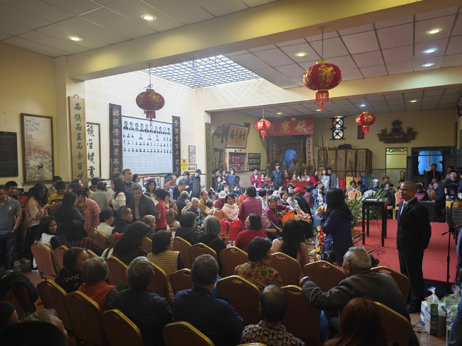 中午12点十分,位于利马市中心的古老的古冈州会馆内已经人头攒动,热闹非凡,近500人参加在会馆大礼堂举办的庆祝仪式。乡亲们携家带口在伏魔殿给关公上香,祈求全家平安富贵,为古冈州先侨牌位上香,祭祖祈福。