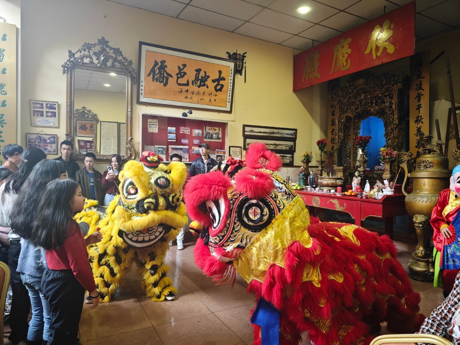 锣鼓喧天,三头彩狮跳跃朝拜,惟妙惟肖,逗人喜爱,在神明大头佛的指引下,红色狮子一跃而起,衔住了悬挂于古冈州会馆大门正上方的生菜完成“采青”,百兽之王一招神狮摆头,狮口扬宝,生菜叶子飞向四周,象征着生财。三头狮子随着锣鼓声舞入古老的会馆大堂,参拜关公和古冈州先侨之牌位,祈求风调雨顺、五谷丰登,带来大家好运和吉祥。