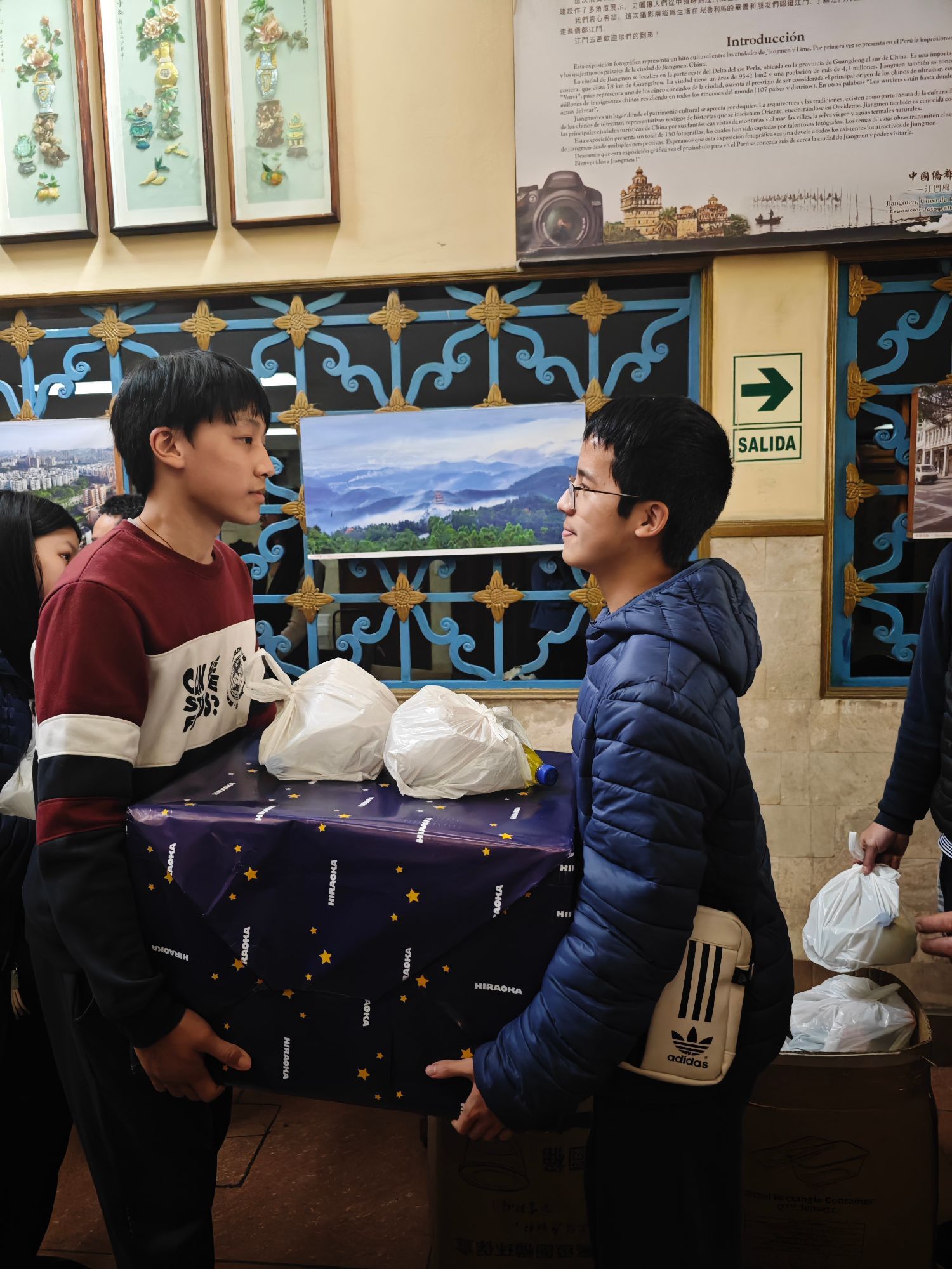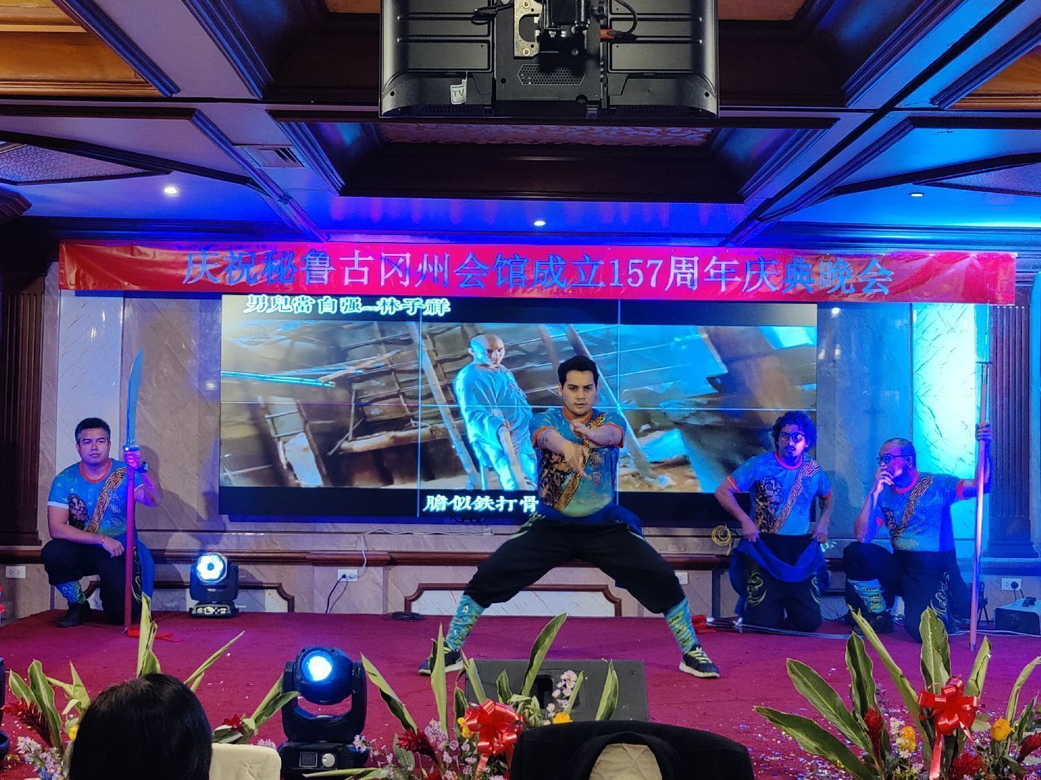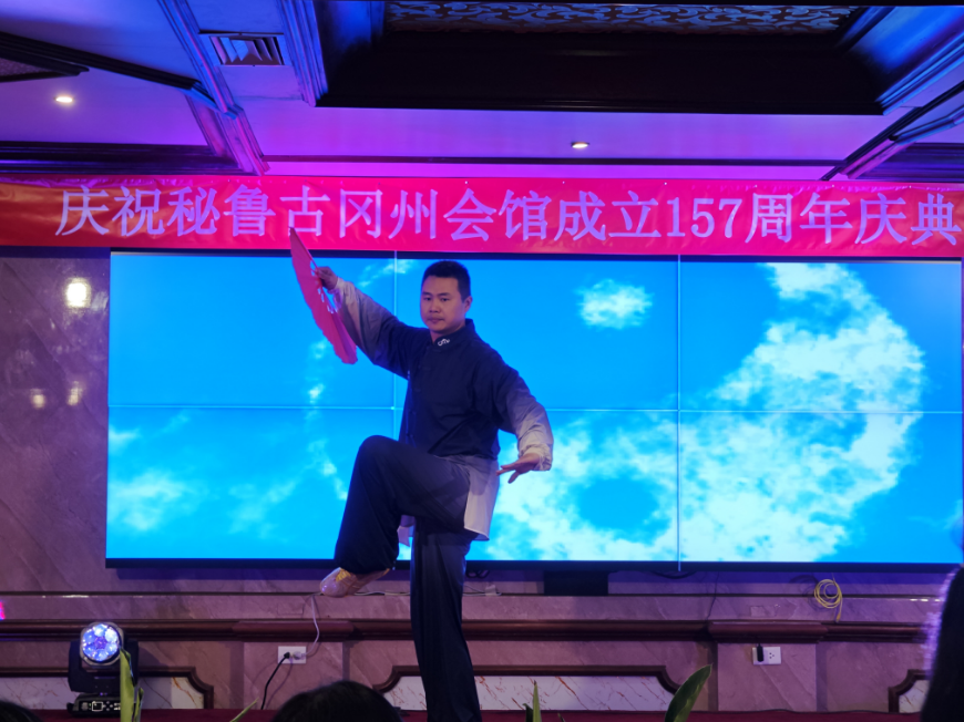 晚宴上欢声笑语、觥筹交错。文艺节目丰富多彩,开场由里卡多·帕尔玛大学孔子学院老师赵峥演唱经典曲目《上海滩》,将风雨兼程、英雄逐梦的画面呈现给大家;秘鲁潮流舞蹈队表演充满青春活力的Hip Pop舞蹈;若望中学的学生用二胡演奏秘鲁民乐《山鹰之歌》,体现着中秘文化的交流与融合;若望中学学生为来宾表演蒙古舞《鸿雁》,演绎了中国北方游牧民族的悠远蜿蜒与豪放洒脱;秘鲁舞蹈家为大家生动演绎了迈克杰克逊的经典舞蹈;通惠总局狮团功夫队表演的南拳体现了广府地区功夫“稳如铁塔坐如山”的强壮威猛、刚劲十足的特点;里卡多孔院苏飞飞老师的太极扇则呈现出中国功夫刚柔相济、飘逸洒脱的民族气韵;里卡多孔院五位老师身着旗袍,手持团扇,随着悠扬的音乐为大家表演了旗袍秀,表现出中华女性典雅清丽的气质;里卡多孔院的两位学生用汉语演唱了《飞云之下》,优美的嗓音和标准的发音赢得宾客好评。