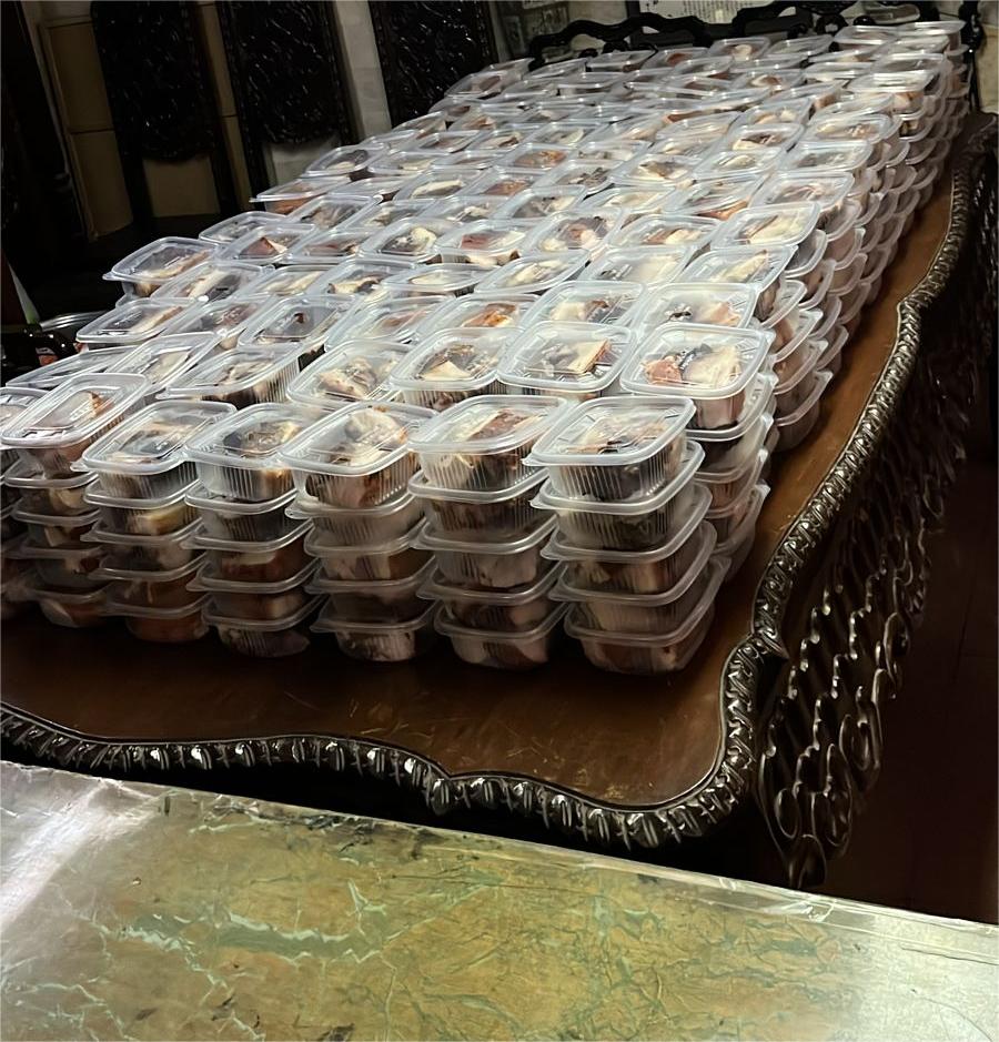 抽奖之后便迎来了“太公分猪肉”的环节。会馆工作人员组织大家排起长龙,依次接过猪肉,分到手的猪肉好比“福肉”,以此来取吉获福。嚼着脆卜卜的烧猪,期待“家肥屋润万事兴,平安笼罩好运绕”。