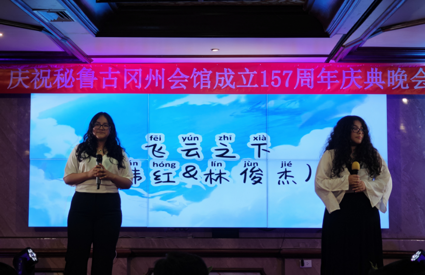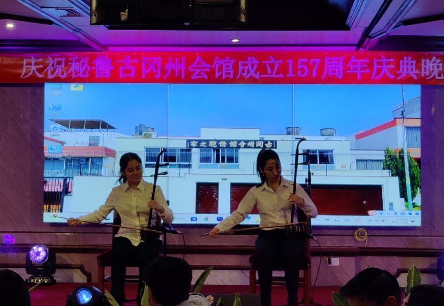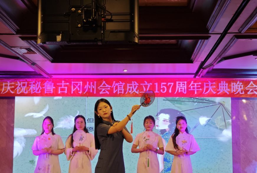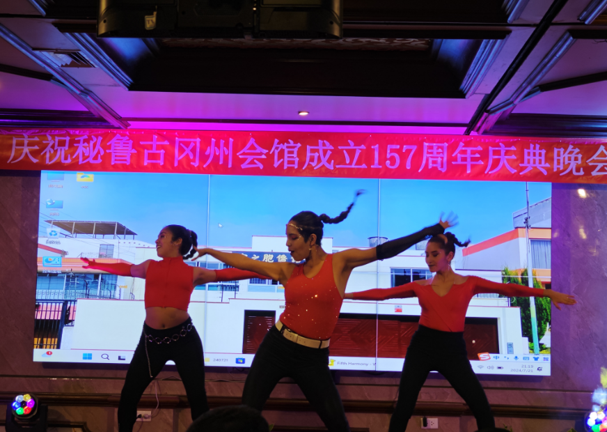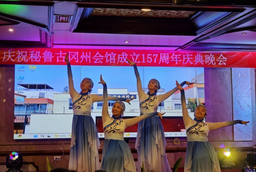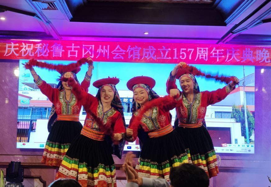 接下来,里卡多孔院4位老师身着秘鲁高原库斯科的民族服饰,为大家表演了Valicha舞蹈。Valicha一词源于秘鲁土著语言克丘亚语,该曲与1945年创作,1958年在秘鲁国家图书馆资源第239号注册,主旨赞美百姓勤劳质朴和面对丰收的喜悦之情。恰逢古冈州会馆成立157周年之际,汉语老师们演绎秘鲁古代印加皇城的民族舞蹈,体现了文化的互融互鉴,反映了全人类对美好生活的共同向往。
