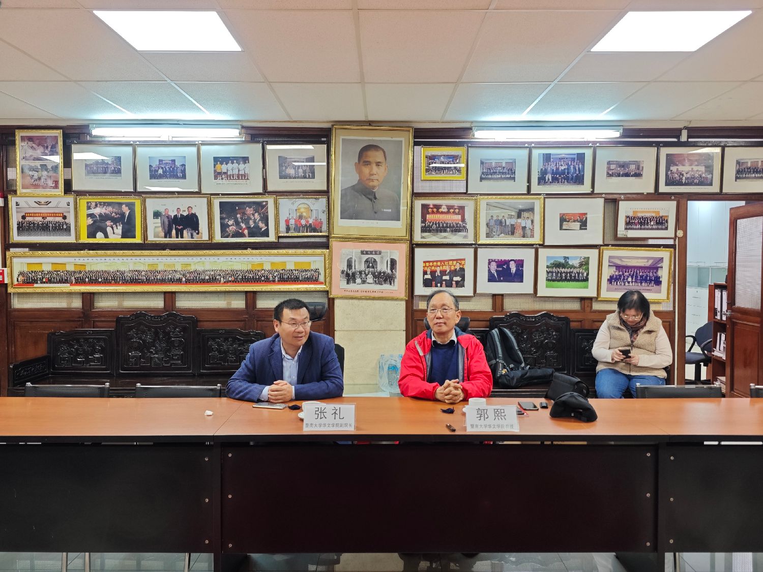 张礼副院长和郭熙教授参观了通惠总局,了解了总局的布局和基本情况,在贵宾室,两位学者看到名人赠予通惠总局的墨宝、瓷器等不禁感慨,通惠总局犹如博物馆一般不但陈列了历史物件更展现了百年来旅秘华人的沧桑旅程。张院长与郭教授认真聆听并收集资料,为课题调研做好充分准备。