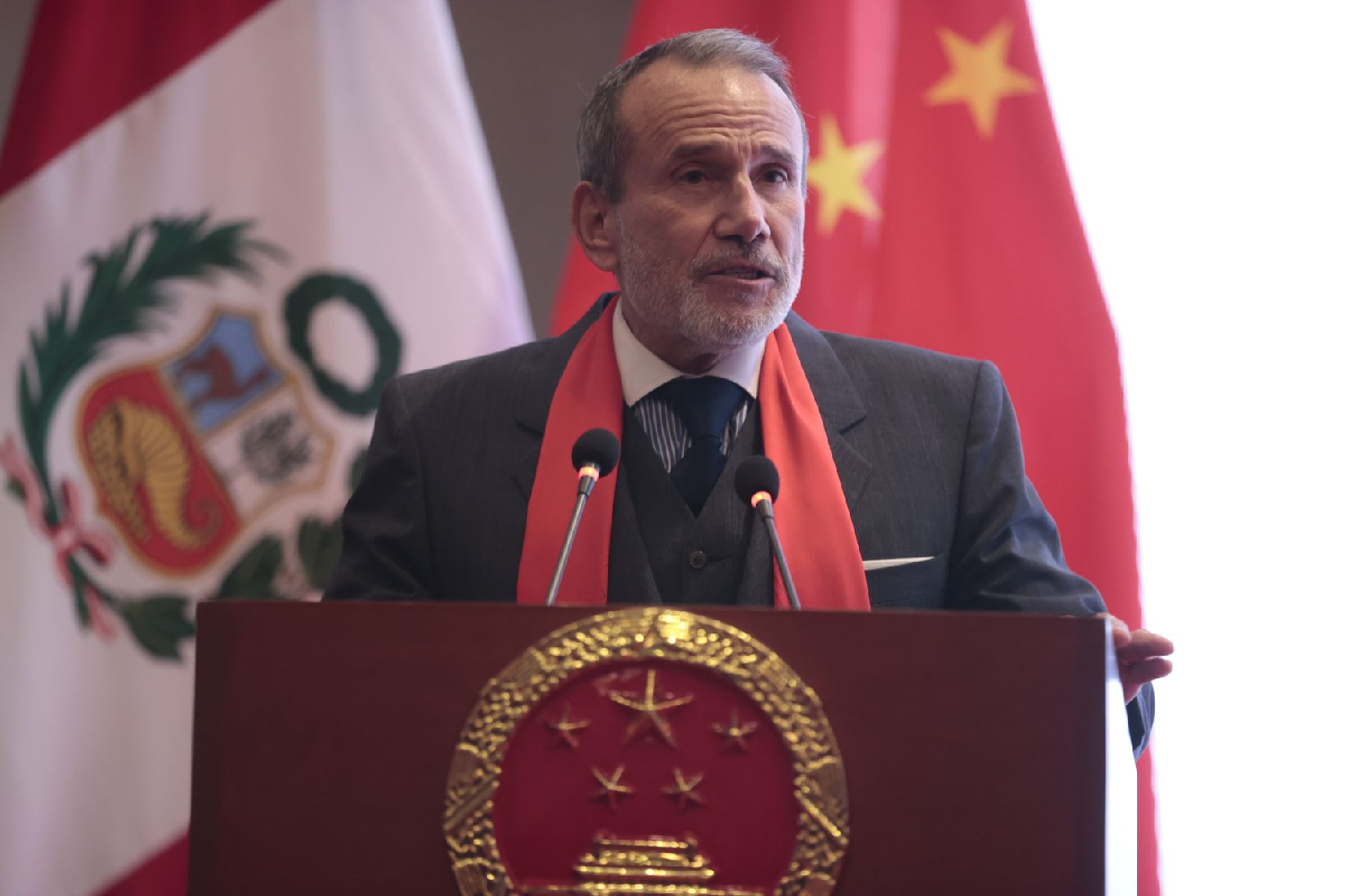 秘鲁政府代表、外交部部长斯基亚莱尔发表致辞,代表秘鲁政府和人民,向中国政府和人民致以最诚挚的祝贺。他表示,自1971年中秘建交以来,两国友谊日益深化,双边关系硕果累累。中国已经连续成为秘鲁第一大贸易伙伴和基础设施、能源行业等领域最主要投资来源国。今年6月秘鲁总统成功访华,巩固了双边关系,紧密了合作纽带,提升了战略水平,双方签署的一系列合作文件让中秘互动上升到了新高度。中秘合作项目钱凯港也让秘鲁在全球舞台崭新亮相,进一步提升了综合国力。与此同时,中秘双边自古以来就有着紧密的人文联系,19世纪中叶,首批华人抵达秘鲁,在秘鲁文化中留下了宝贵的印记,中餐、中医药、中国节日都对秘鲁社会产生了深刻的影响。秘鲁政府重申,将继续坚定不移地深化中秘双边友谊,全面推动发展共赢。最后祝中国国泰民安,繁荣昌盛。