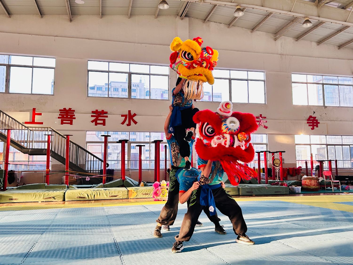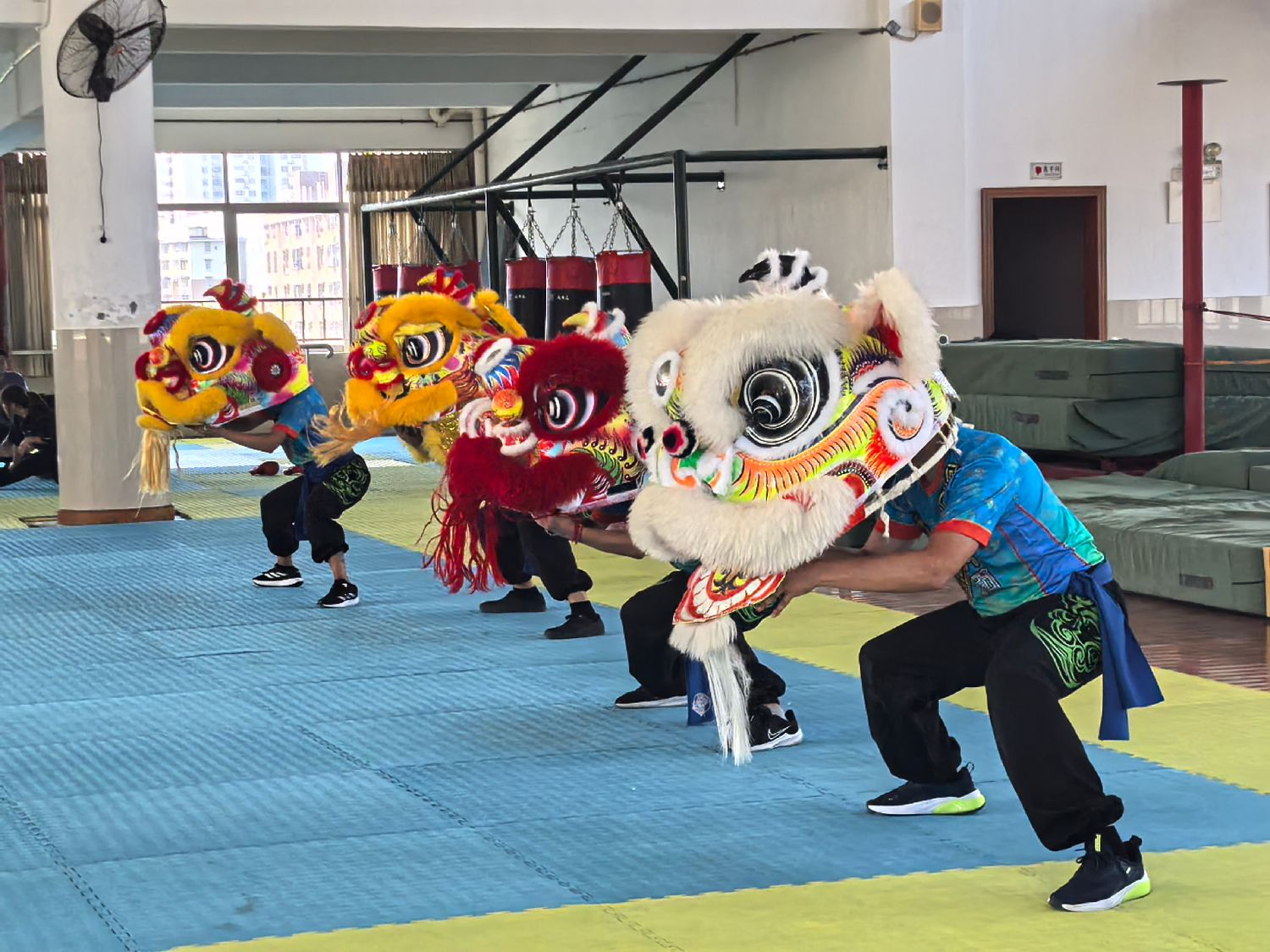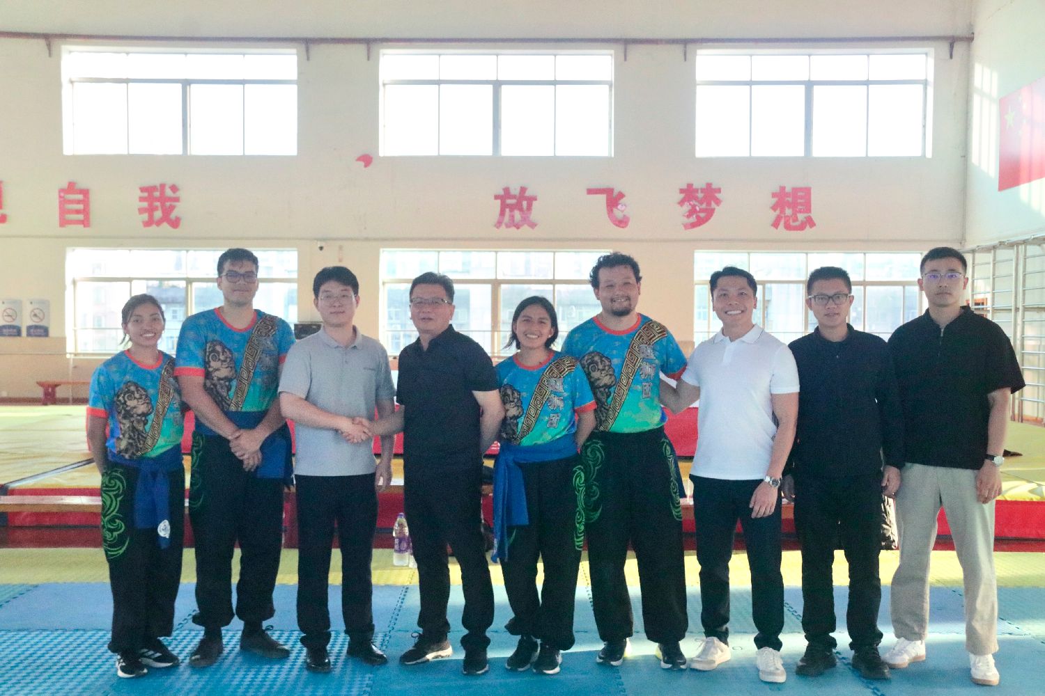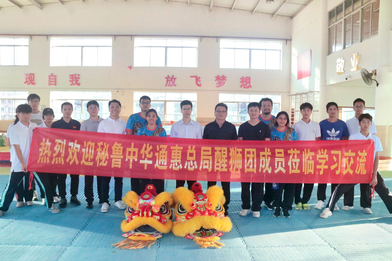 在吴东昇书记的带领下,秘鲁中华通惠总局醒狮团成员来到武术套路馆,共同欣赏了一场精彩纷呈的武术展演。随后,大家一同前往龙狮训练馆,开始舞狮技术学习。在陈晓丹副教授的耐心指导下,成员们专心致志地学习南狮的基本动作和套路,学员们全身心投入其中,沉浸于舞狮技艺的研习中。