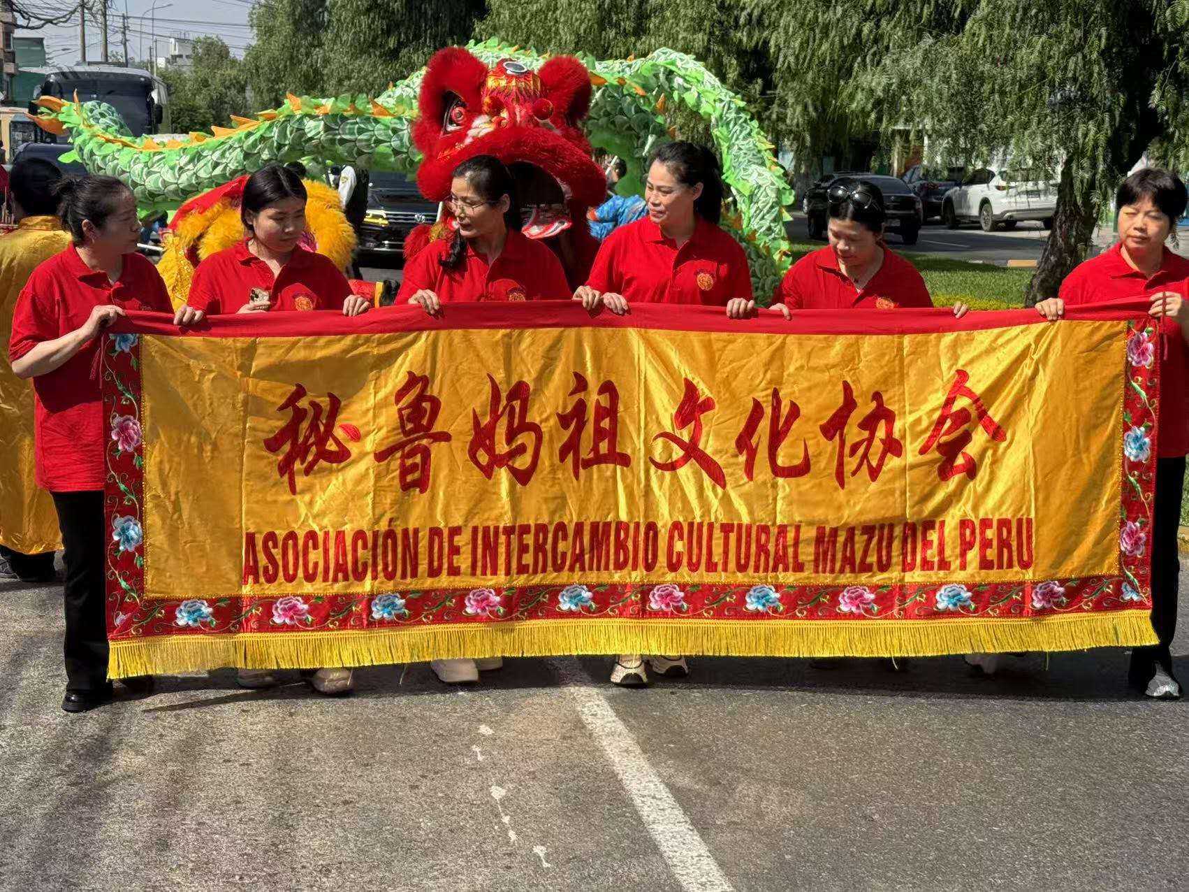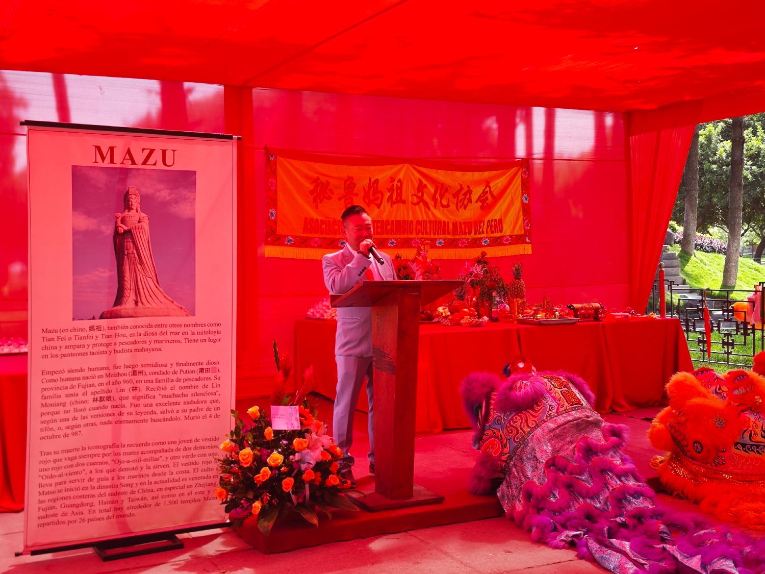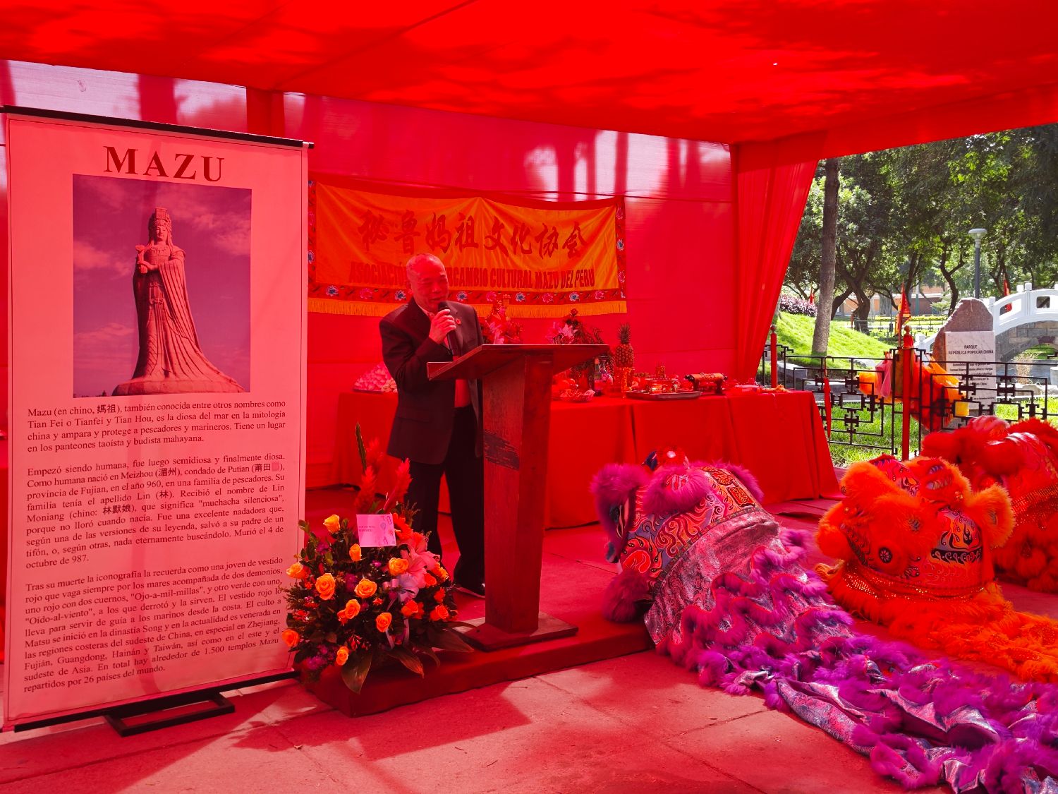 活动由秘鲁侨界知名人士、《华人头条》秘鲁社社长务秋主持。随着舞龙舞狮锣鼓喧天,信众队伍手抬横幅进入中国公园,气氛庄严热烈。妈祖生日纪念仪式正式拉开帷幕,鲜花、贡品陈列于神坛前,香烟缭绕,祈福声声,彰显着妈祖信俗的深厚民间根基。