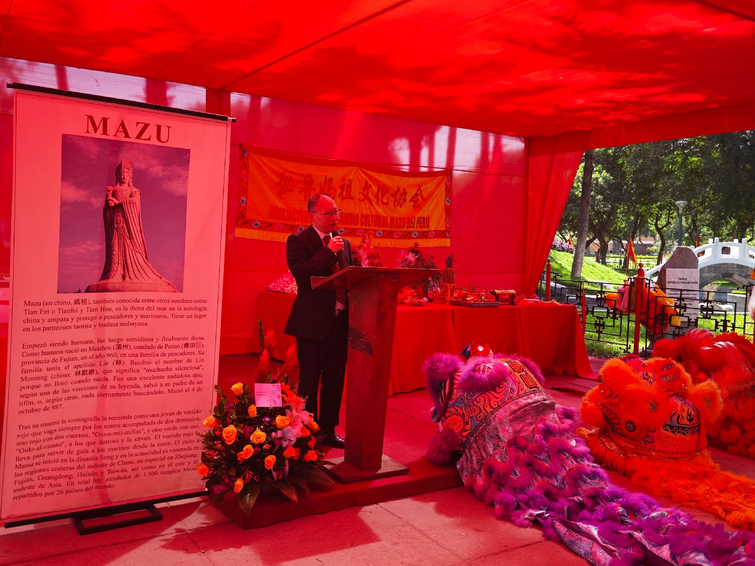 中国驻秘鲁大使馆次旺平措公使在致辞中指出:“妈祖信俗不仅是中华优秀传统文化的重要组成部分,也是世界人类文化遗产的重要代表。妈祖的慈悲、舍生济难、大爱精神,体现了中华民族的文化内核。”他强调,妈祖信俗在海外的传播不仅加深了秘鲁民众对中华文化的了解,更是中秘文明互鉴与友谊延续的重要体现。他提到:“妈祖短暂一生却感动千年,她的善行成为中国人认识海洋、敬畏自然的重要象征。我们今天在秘鲁纪念妈祖,是中秘两国人民友谊的体现,也是两国文化交流的重要平台。”