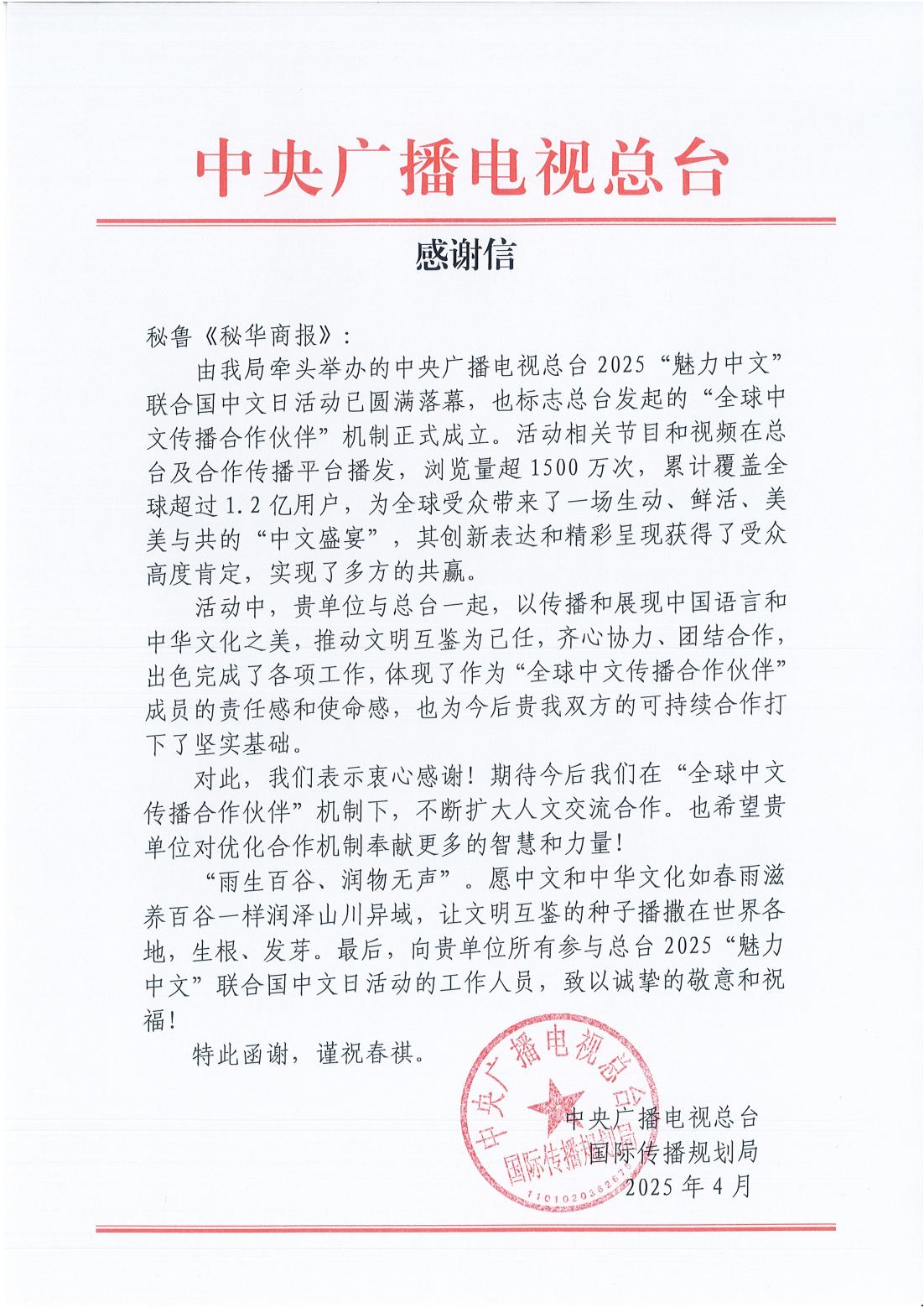 为表彰《秘华商报》在此次活动中的突出贡献,中国中央广播电视总台特地向本报致感谢信。信中写道:“我们对《秘华商报》表示衷心感谢!期待今后我们在‘全球中文传播合作伙伴’机制下,不断扩大人文交流合作。也希望贵单位对优化合作机制奉献更多的智慧和力量!‘雨生百谷、润物无声’,愿中文和中华文化如春雨般润泽世界,让文明互鉴的种子播撒在各地,生根发芽。”