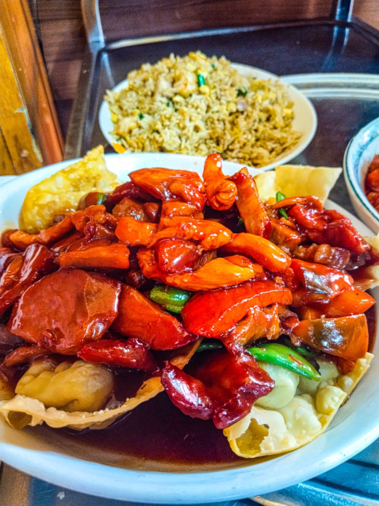 Ana Tong Luna热情邀请《秘华商报》来访者品尝店内四道经典招牌菜肴,分别是Ojo deDragón,虾肉丸子,内包腰果,配蚝油炒时蔬;第二道菜是Kam Lu Wantan,鸡肉馅炸馄饨配酸甜酱,是秘鲁经典Chifa菜肴,很多秘鲁民众的最爱;第三道菜是Arroz Chaufa Centenario(百年纪念炒饭),中央酒家招牌炒饭,Ana高兴地说,世界著名旅游美食杂志《TasteAtlas》今年把中央酒家的炒饭评为世界上最好吃的炒饭。炒饭色泽金黄,粒粒大米饱满圆润,配以松软的鸡蛋碎和秘鲁当地人爱吃的海鲜和肉丁,点缀着翠绿的葱花,着实诱人;第四道是一例汤,名为Sopa Chung Yion Especial,汤内有叉烧肉片,鹌鹑蛋、虾仁和菜心,美味可口,材料丰富,让人垂涎欲滴。如果说东北的小鸡炖蘑菇、山东煎饼卷大葱、陕西羊肉搭泡馍,那么,在秘鲁的中餐馆,一定是Chifa配印加可乐,成就了这一永恒经典,正体现了中餐在秘鲁当地社会的完美融合。