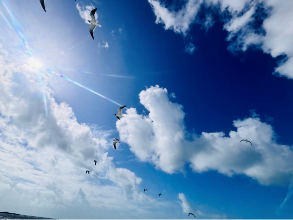 在岛上的第二天,我报了团出海浮潜。乘船出海的时候,海鸥一路追随着我们的船,关于远方的想象,都在那对舒展的羽翼上,看着它们在空中自由的翱翔。准备下海前,导游说:“你们准备好去和老朋友见面了吗?”我不懂他的意思,直到我真正跳入水中——透明的海水之下,一只巨大的海龟缓缓游过,目光温柔,动作优雅。那一刻,我几乎忘了呼吸,与海龟共泳还真是奇妙。以后的某天或许我会回忆起,和海龟共享过某段航程。后来还看到成群的彩色鱼类、珊瑚礁,它们在水下共舞,仿佛这个世界从未被打扰过。那种与大自然融为一体的静谧与纯净,是陆地上再奢华的景色都无法替代的。