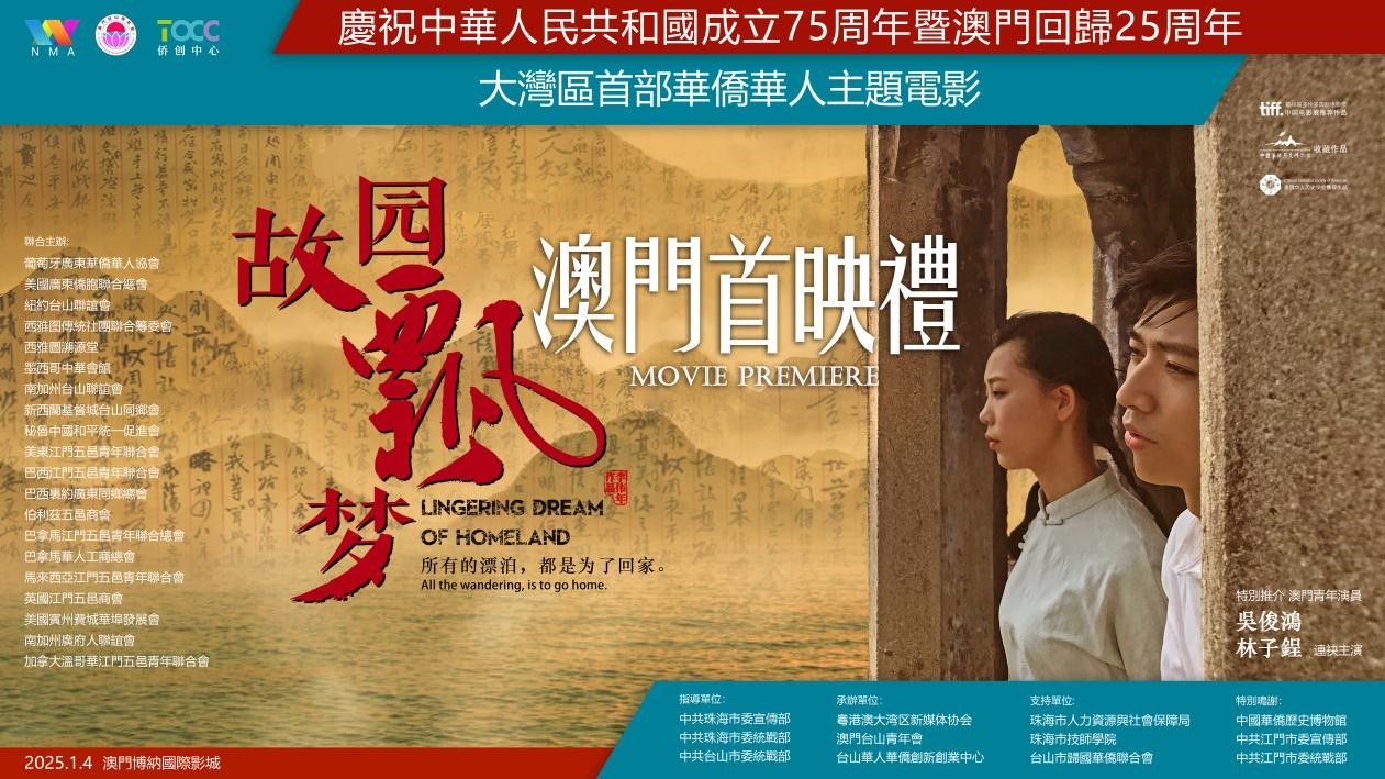 在中国澳门,为促进华侨华人文化的传承与发展,由二十多个海外华侨社团携手本地团体等联合主办的大湾区首部华人华侨电影《故园飘梦》,1月4日下午在澳门博纳国际影城首映,冀藉影片促进澳门与湾区各市的文化交流,增进华侨华人的身份认同和文化自信。主办方华侨代表雷康宁表示:这部影片讲述华人华侨人在海外的漂泊史与文化追寻,深有共鸣,让他们重新审视身份,并呼唤年轻一代继续传承这份文化,希望这部电影能激励更多人去了解和珍视华侨华人的历史贡献。承办方代表、澳门台山青年会理事长伍剑佐表示:澳门青年在粤港澳大湾区中扮演着重要的角色,吴俊鸿和林子锃两名青年这次作为电影主演,不仅是参与者,更是受益者;澳门青年通过参与大湾区的各种活动和文化体验,见证并参与改革与发展,找到了属于自己的机遇与责任。承办方代表、粤港澳大湾区新媒体协会副会长兼秘书长杜燕红表示:该电影致力挖掘侨乡历史,尊重史实,片中还原大量的广东民俗文化,是一部原汁原味的岭南侨乡风情电影;在澳门首映,可为本土电影产业注入一股新力量,也为澳门观众打开一扇了解华侨历史、感受华侨文化的视窗。根据活动主办方介绍,此次澳门电影首映活动是自黄茅海大桥开通后,海外二十多个华侨社团联合牵头主办,首个由澳门、珠海、台山三地共同参与的一个文化活动,现场有来自世界各地多位侨界领袖参加,各地代表皆希望筹拍第二套同主题电影,延续《故园飘梦》的家乡情怀。澳门全国人大代表、中国侨联副主席刘艺良和珠海市统战部代表分别为影片男女主角和导演李伟年颁发嘉奖状,表彰他们为大湾区的文化事业交流、走向世界做出的努力。出席当天活动的嘉宾还有:澳门中联办协调部代表尹小兰、澳门文化局代表何鸿斌、澳门旅游局代表熊蓓玲、澳门旅游发展委员胡惠芳、珠海市委统战部副部长邹焕忠、珠海市委党史研究室副主任张红梅、台山市委常委兼统战部部长李白云、珠海市人力资源与社会保障局副局长全冠、珠海市技师学院院长黄国军、台山市归国华侨联合会主席陈达旋等。(江门市侨媒中心:黄柏军、李伟年/摄影报道)
