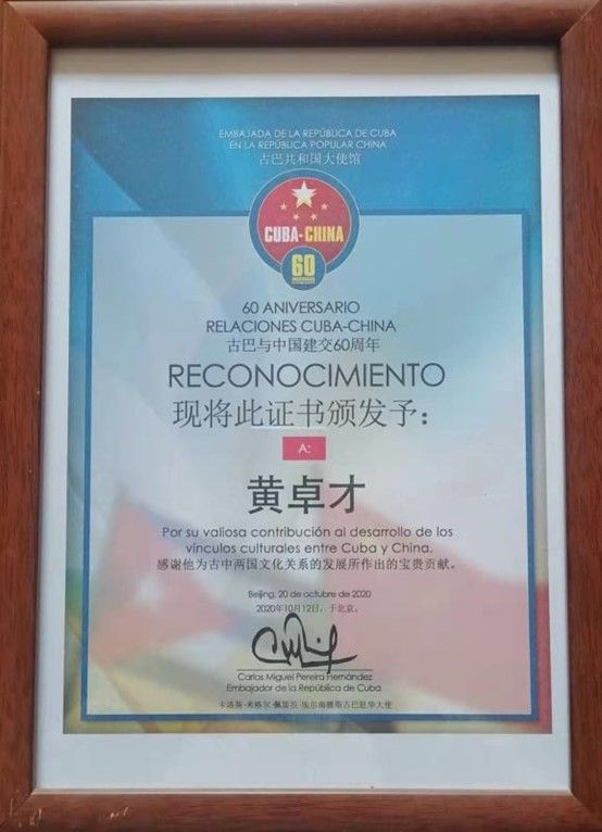 图为古巴驻华大使签发的证书,表彰黄卓才对中国-古巴文化交流所作的贡献
