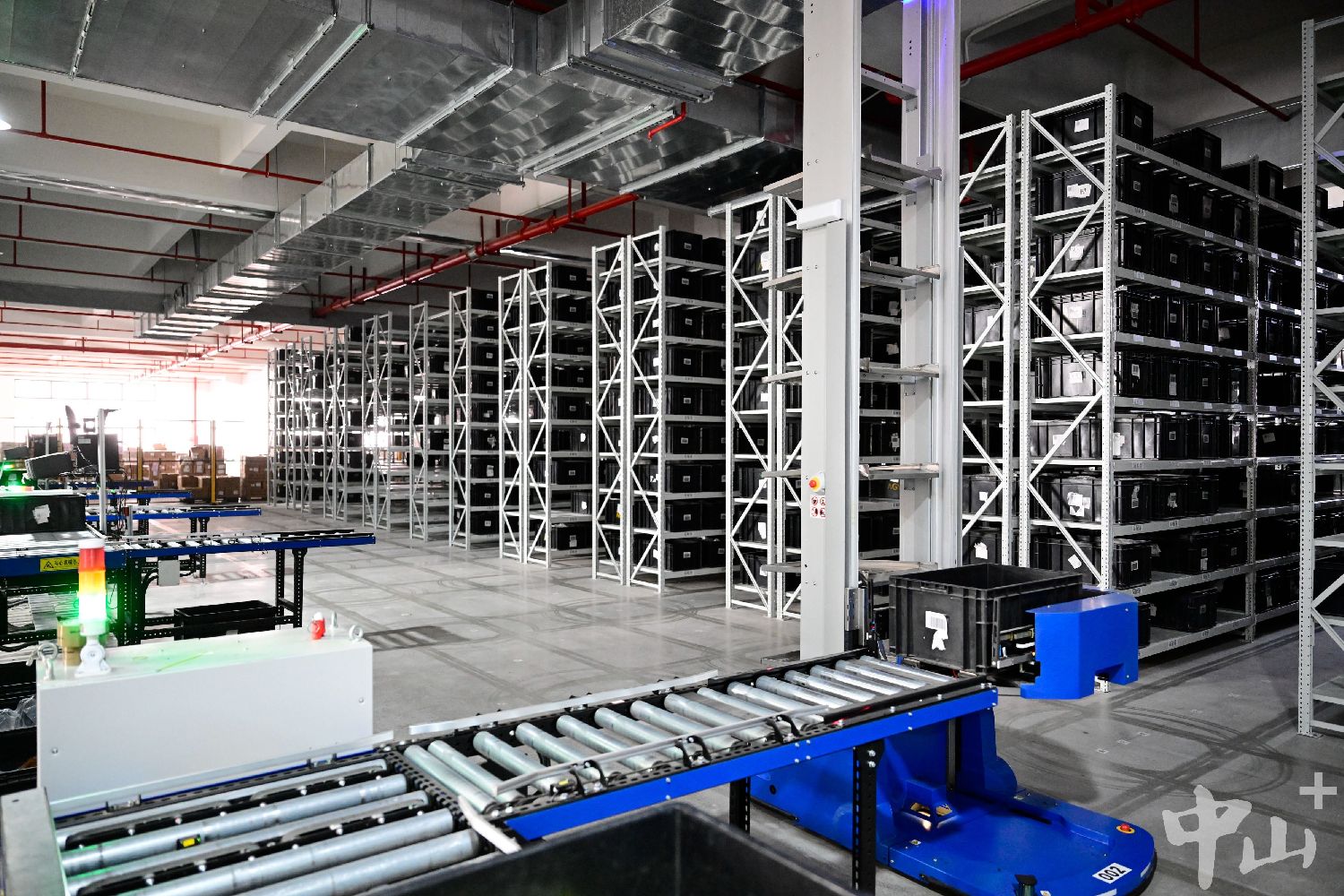 记者跟着制造总监李湘波走进智能仓库,这里大约存放了900多种物料。但负责备料的工人却寥寥可数,只见几台机器人在高大的货架间来回穿梭。