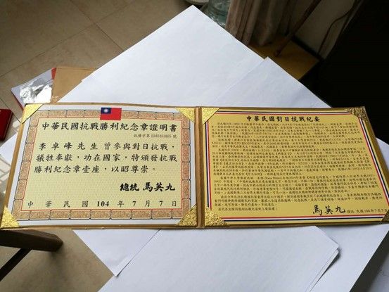 眨眼之间,抗战胜利80周年来临了,我的卓峰舅舅也为国牺牲84年了,我们这个华侨家族从来没有忘记过他,他为国捐躯,他是我们家族的光荣与骄傲。舅舅为抗战而牺牲,一直没有拿到一纸证明,这也成为我们后辈最大的遗憾。为了弥补这一遗憾,我们开始了漫长的求证之路。功夫不负有心人,经过李卓峰烈士子女的申请,2015年7月7日,中国台湾时任领导人马英九亲自为烈士亲属签署颁发《中华民国抗战胜利纪念章证明书》。该证明书标注:抗胜字第1040401665号。证明书内容如下:“李卓峰先生曾参与对日抗战,牺牲奉献,功在国家,特颁发抗战胜利纪念章一座,以昭尊崇。” (详见附图)