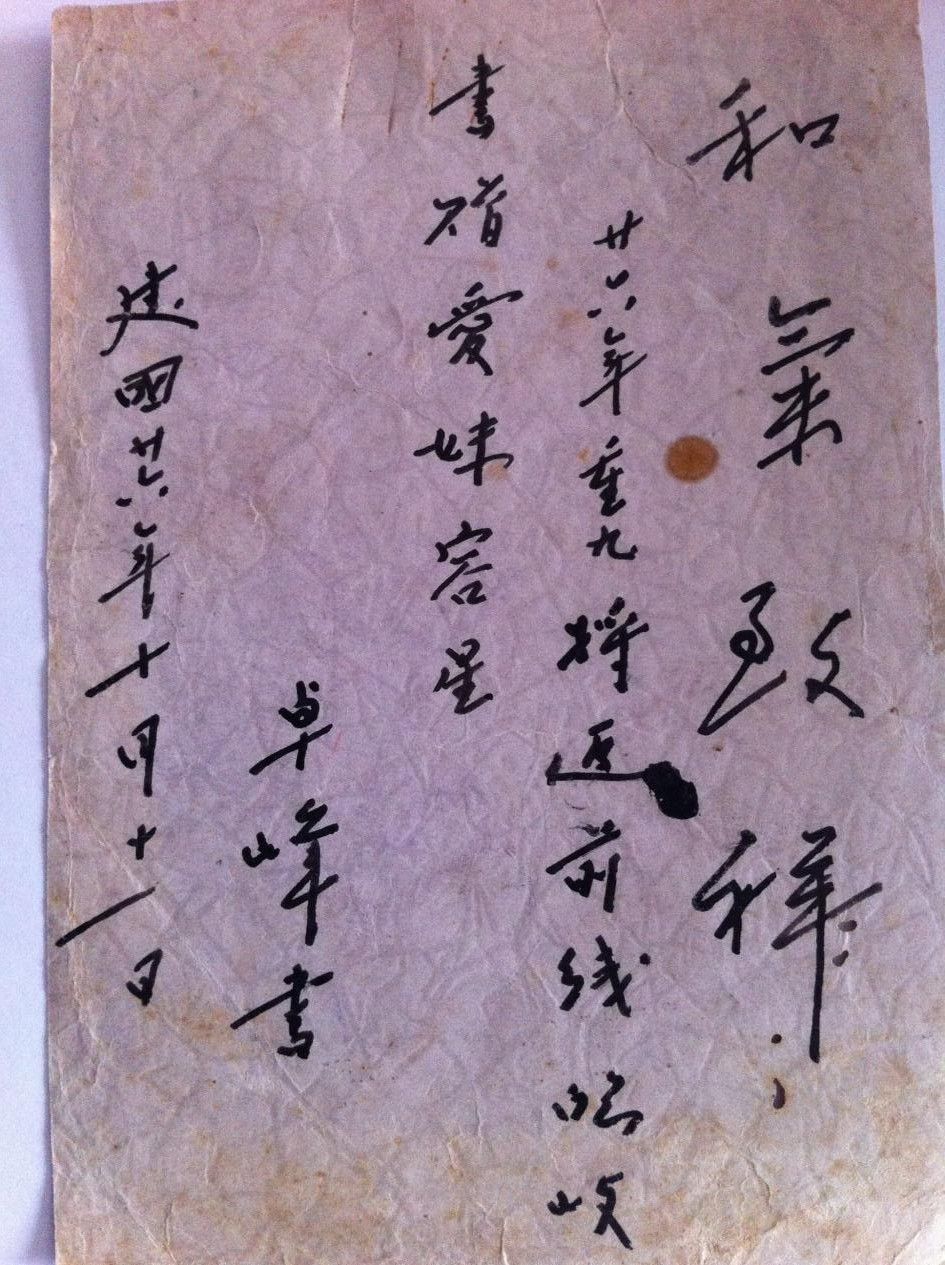 在烈士胞妹、我的母亲李容星的记忆里,哥哥的军人生涯与抗战紧密相连。李卓峰刚从军校毕业就面临着抗日战争的全面展开,他回到家里没有住上几天就奔赴前线,李容星清晰记得,哥哥离家那天是1937年10月12日(农历九九重阳节),爷爷、奶奶和母亲亲自送别长孙(长子)奔赴战场,家人们殷殷叮嘱,依依不舍。李卓峰离家前,专门为自己最心爱的妹妹李容星书写了“和气致祥”的题词作为留念。李卓峰烈士牺牲后,这幅题词被李容星珍藏至今,成为弥足珍贵的抗战纪念文物,也是李家最珍贵的传家之宝。