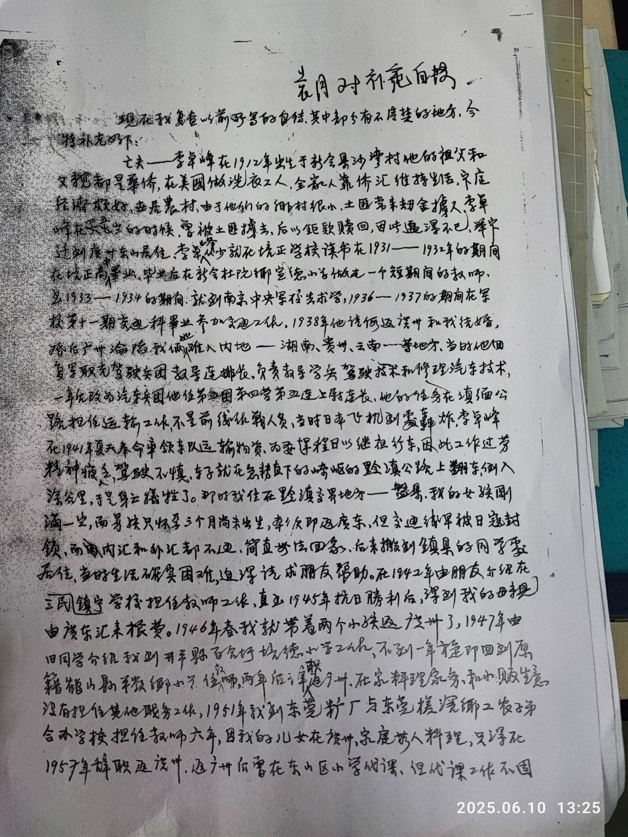 图为李卓峰烈士遗孀袁月对女士生前亲笔撰写关于烈士事迹的回忆文章手稿