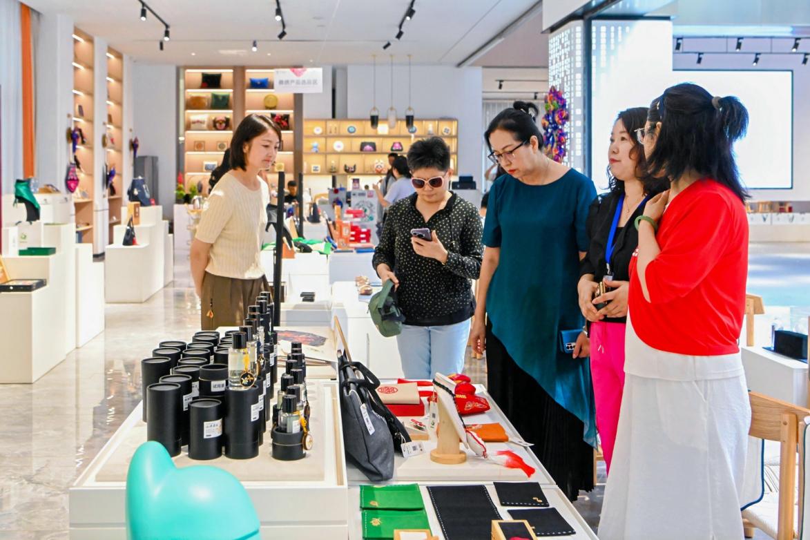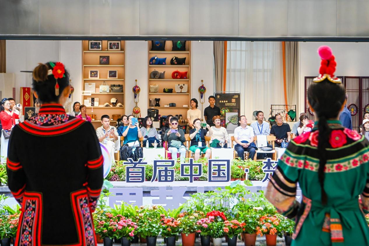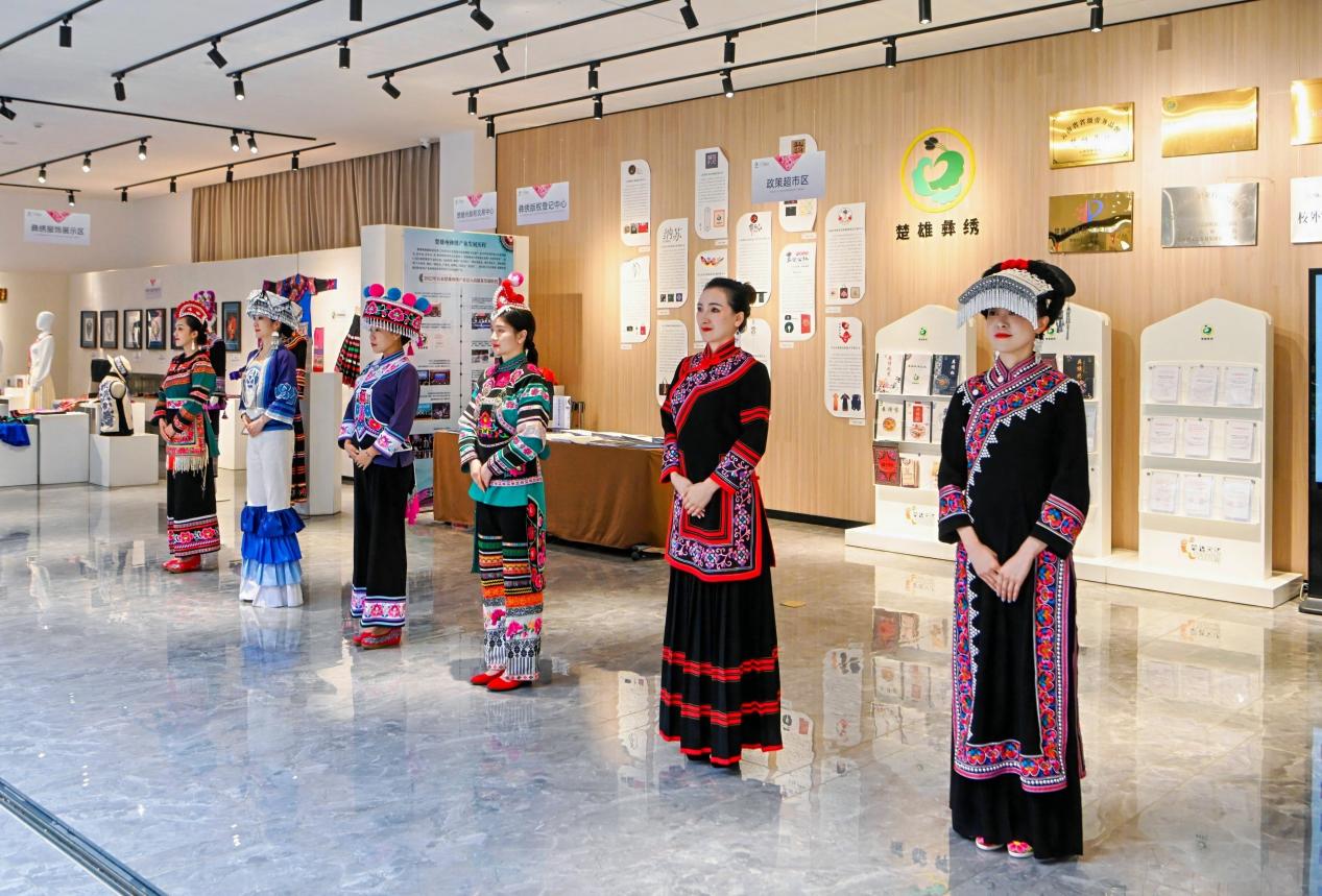 在楚雄彝绣数字文化产业园·彝绣产品交易中心,琳琅满目的彝绣产品和精彩的彝绣秀吸引众多市民游客参观。