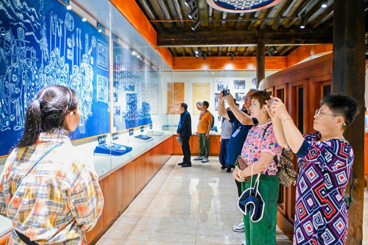 图为游客参观璞真白族扎染博物馆。