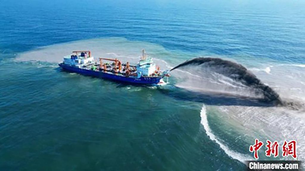 我国自主研发的全新一代超大型自航绞吸式挖泥船“新海鲨”在中东地区浅海海域开展人工岛的吹填作业。 上海市经信委供图