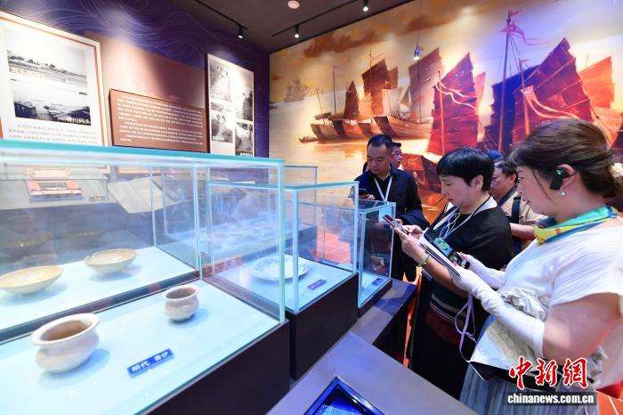 9月10日,“行走中国·2025海外华文媒体漳州行”活动在明代海上丝绸之路的始发港——福建省漳州市龙海古月港启动。12国17家海外华文媒体代表来到著名侨乡漳州参加“行走中国”系列活动。图为海外华文媒体代表在位于龙海区的月港海丝馆参访。中新社记者张斌摄