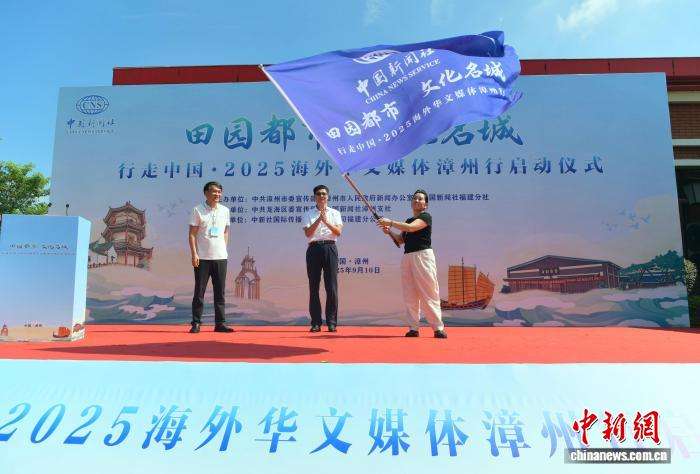 9月10日,“行走中国·2025海外华文媒体漳州行”活动在明代海上丝绸之路的始发港——福建省漳州市龙海古月港启动。12国17家海外华文媒体代表来到著名侨乡漳州参加“行走中国”系列活动。图为授旗仪式。中新社记者张斌摄