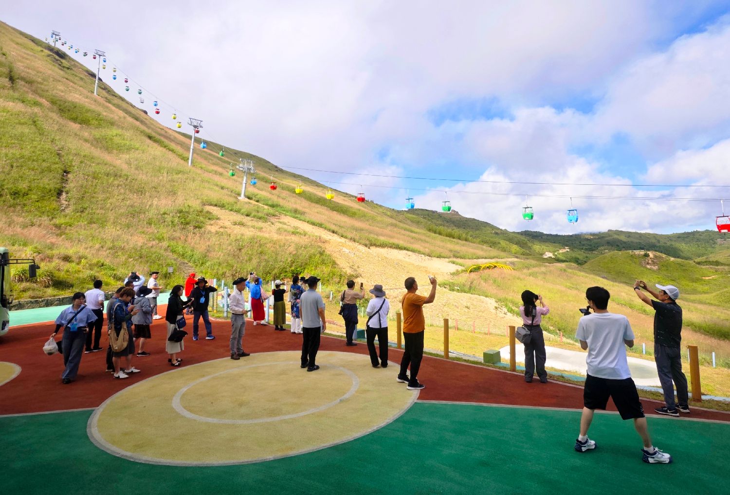 海拔千米的高山草场上,游客们或乘坐观光童话小火车,或体验彩虹滑草项目,欢声笑语不断。