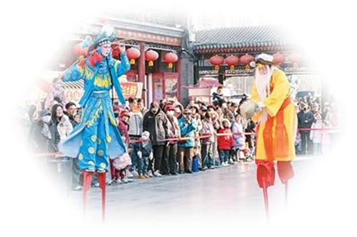 在天津南开区古文化街宫前广场,高跷队正在演出。